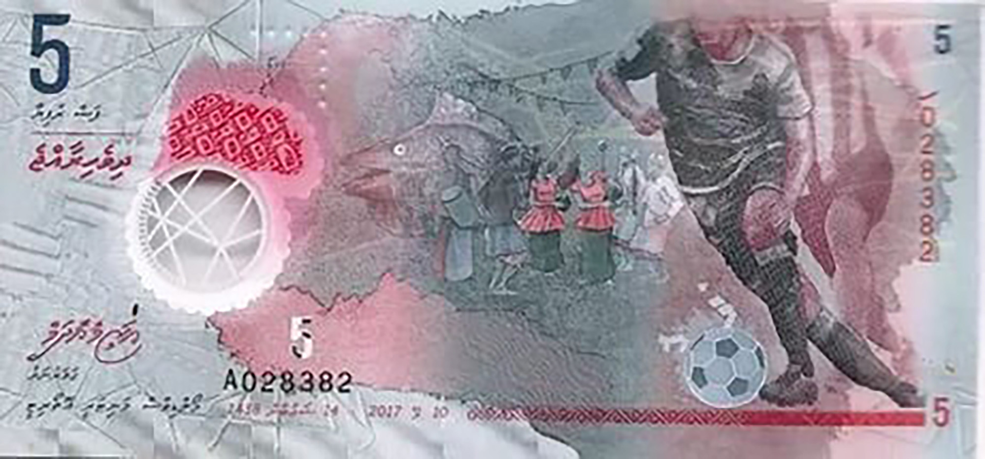 Лицевая сторона: аверсе банкноты отображен известный футболист, уроженец Мальдив, по имени Али Ашфак. В профессиональном футболе он более известен как Dhagandey. Следуя традициям Ислама лик мастера спорта не изображен. Задний план банкноты украшен музыкантами и танцорами, которые танцуют традиционный национальный танец. Также присутствует изображение океанской рыбы..