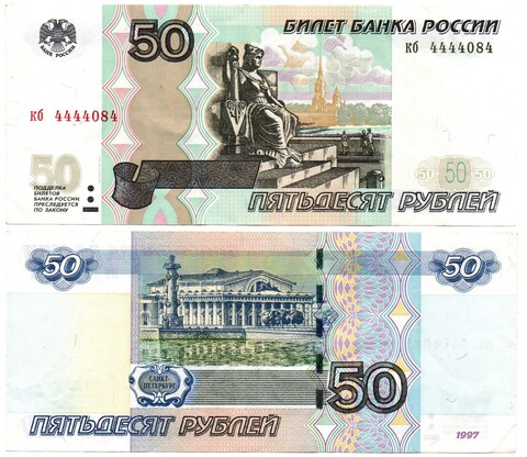 Банкнота 50 рублей 1997 г. Модификация 2004. Красивый номер 4444084. VF
