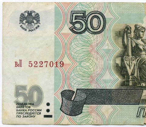 Банкнота 50 рублей 1997 год (без модификаций) вЛ 5227019. F (надрывы)