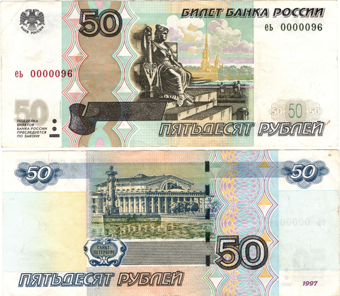 Банкнота 50 рублей 1997 Мод. 2004 Красивый номер Низкий номер еь 0000096 XF-