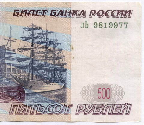 Банкнота 500 рублей 1997 год. Модификация 2004 года лЬ 9819977. F (чистка)