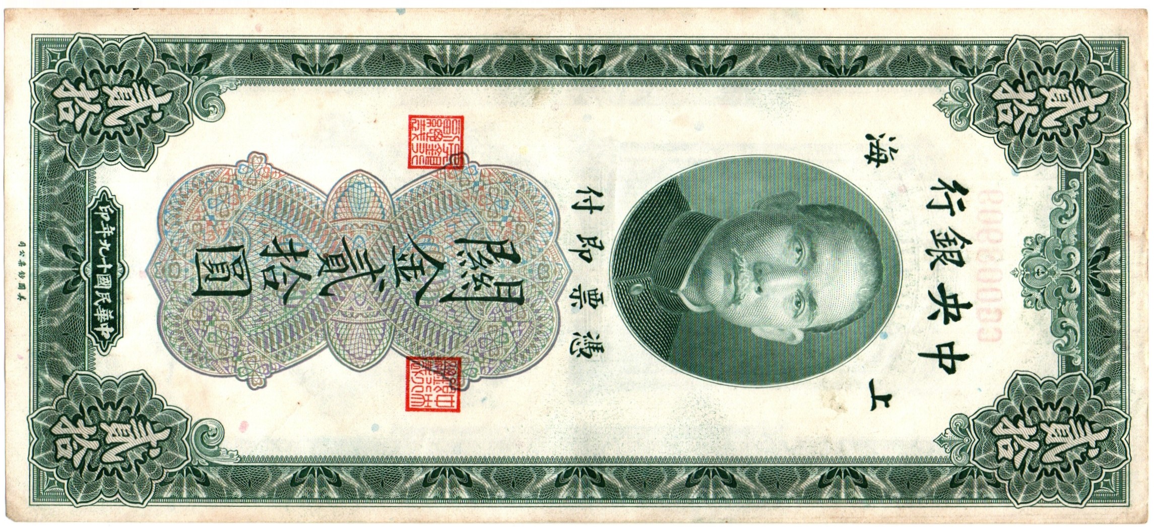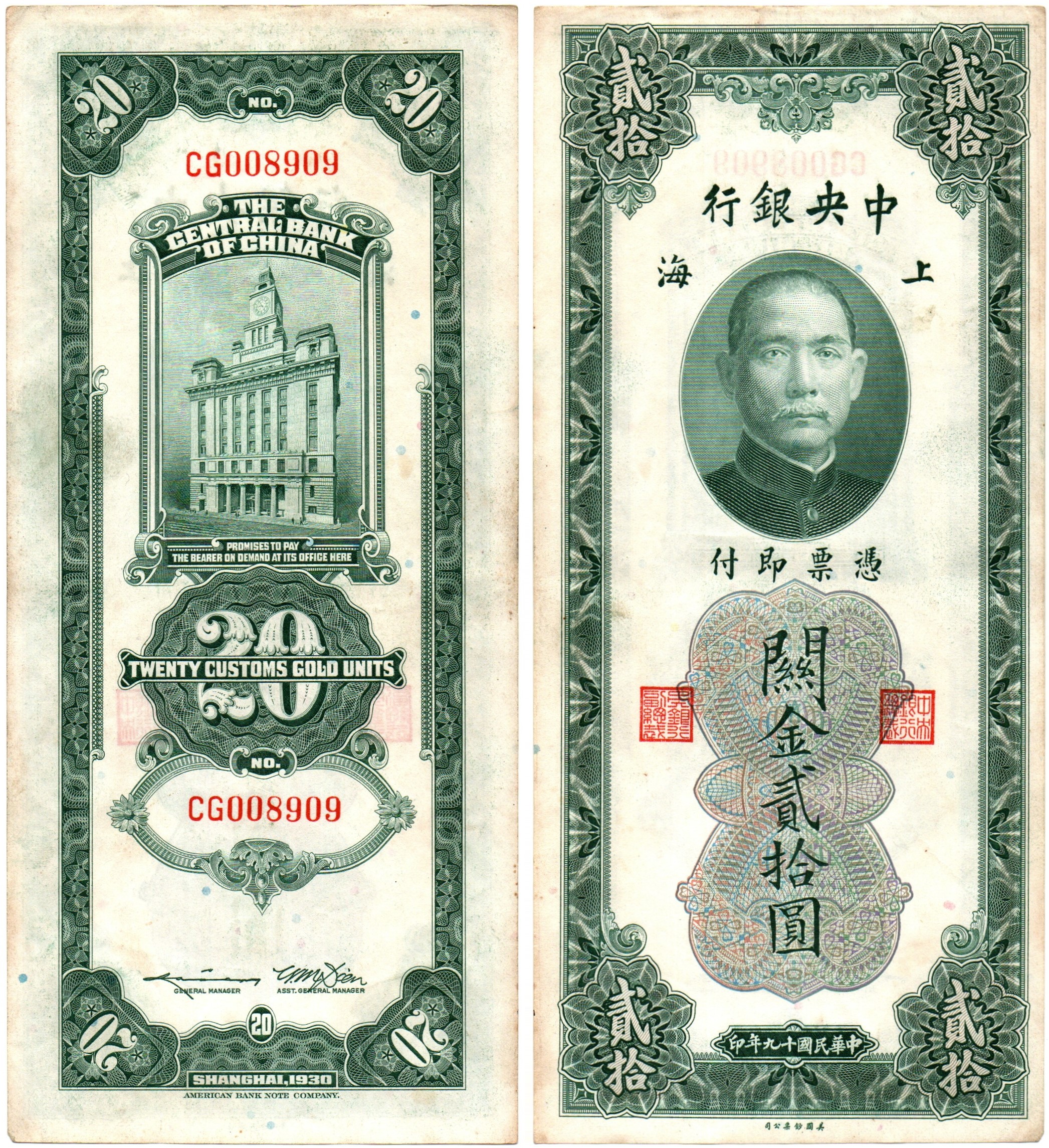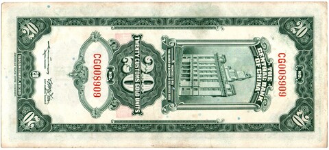 Банкнота Китай 20 Золотых таможенных единиц - Сунь Ятсен - 1930 год