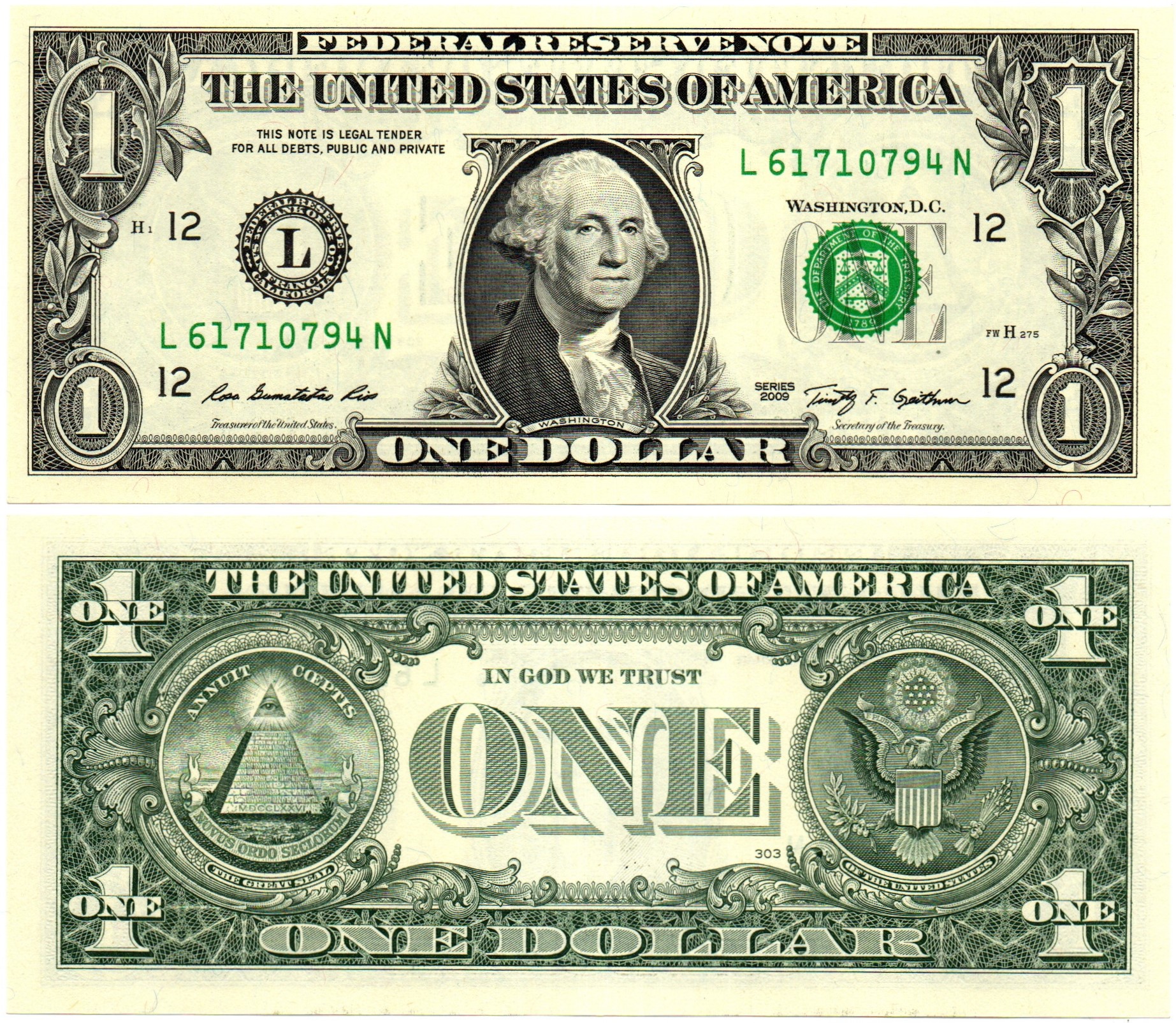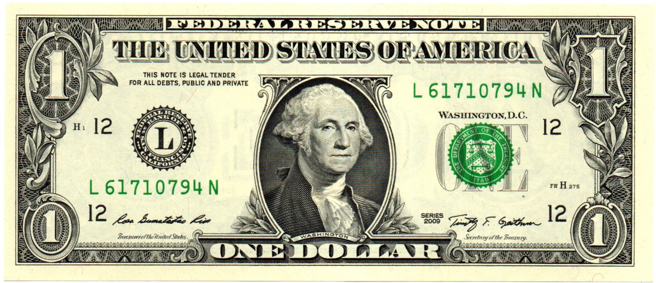Банкнота США 1 доллар 2009 год - L 61710794 N (Калифорния). AUNC