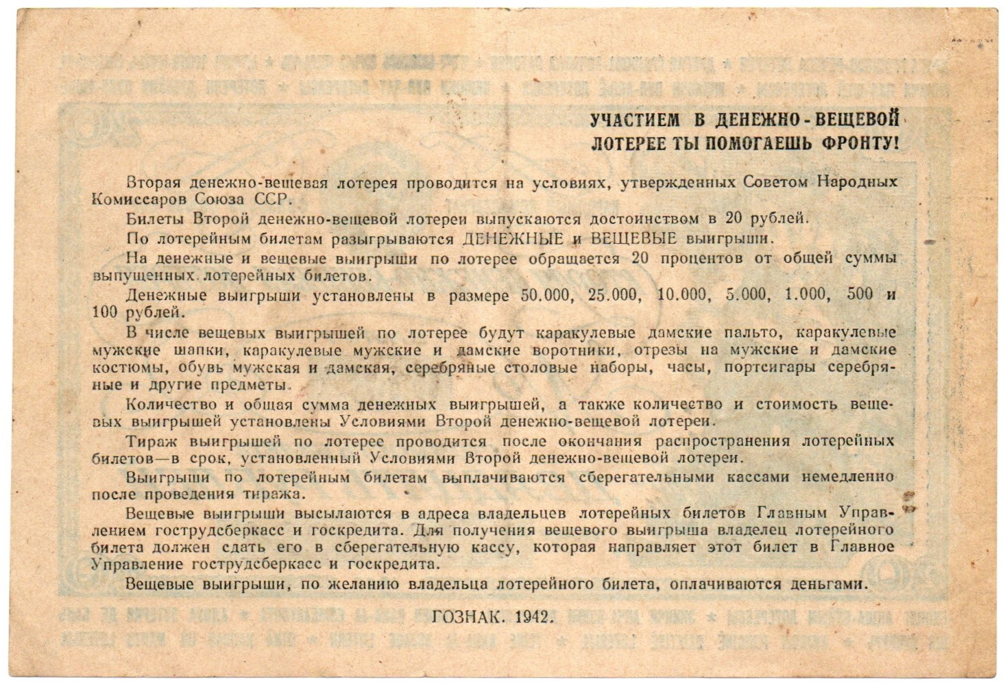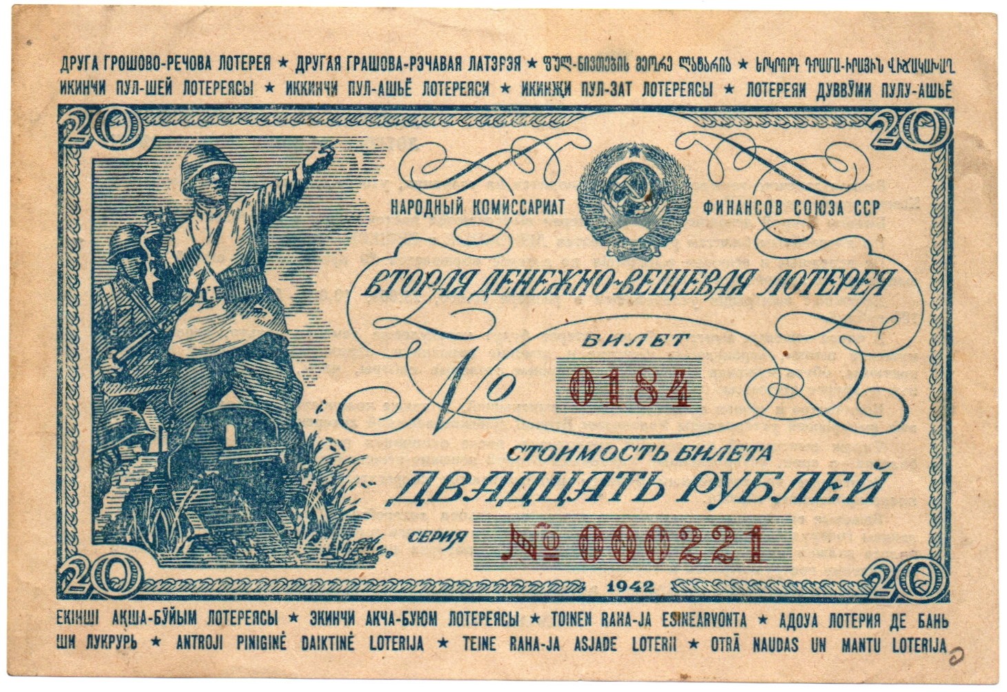 Билет 2-й денежно-вещевой лотереи НАРКОМФИНА СССР 1942 год - 25 рублей - Серия 000221