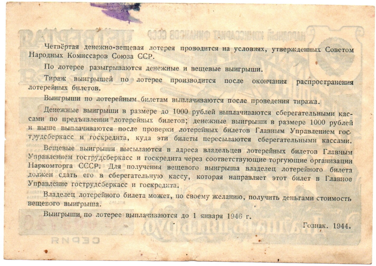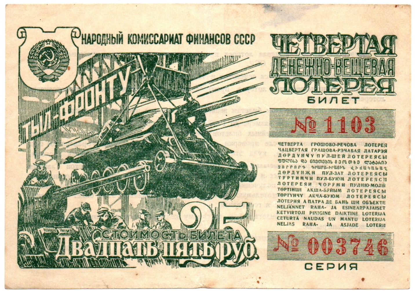 Билет 4-й денежно-вещевой лотереи НАРКОМФИНА СССР 1944 год - 25 рублей - Серия 003746