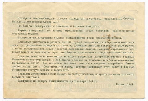 Билет 4-й денежно-вещевой лотереи "Тыл-фронту" НАРКОМФИНА СССР 1944 год (25 рублей). VF