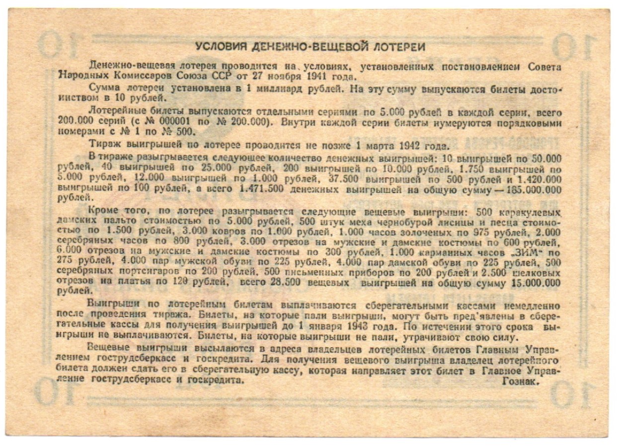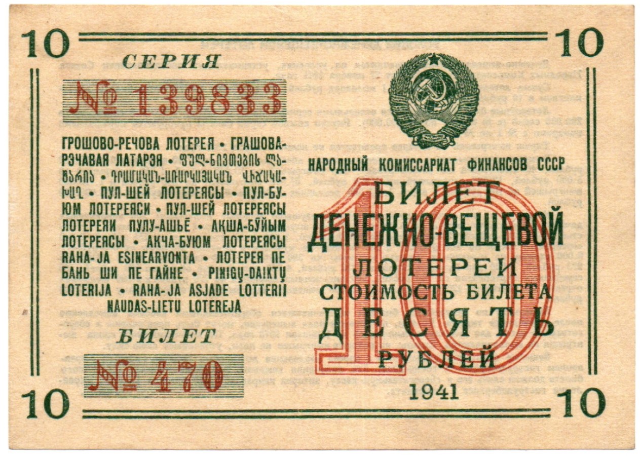 Билет денежно-вещевой лотереи 1941 год - 10 рублей № 470 серия 139833