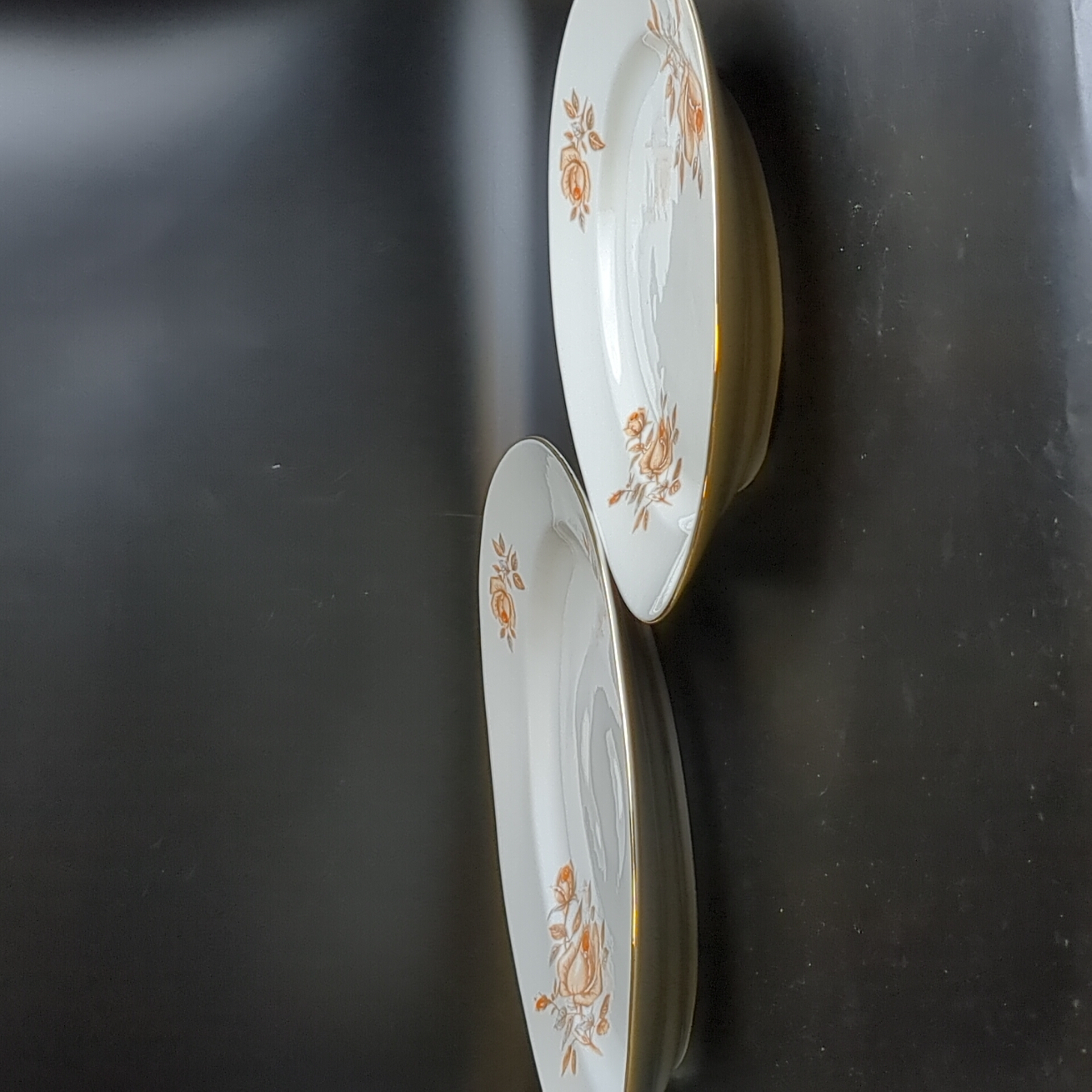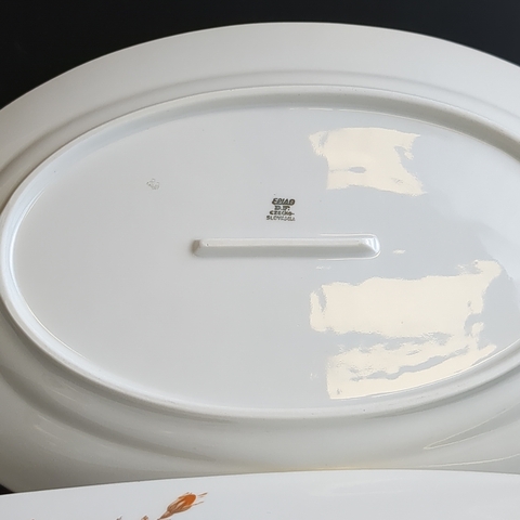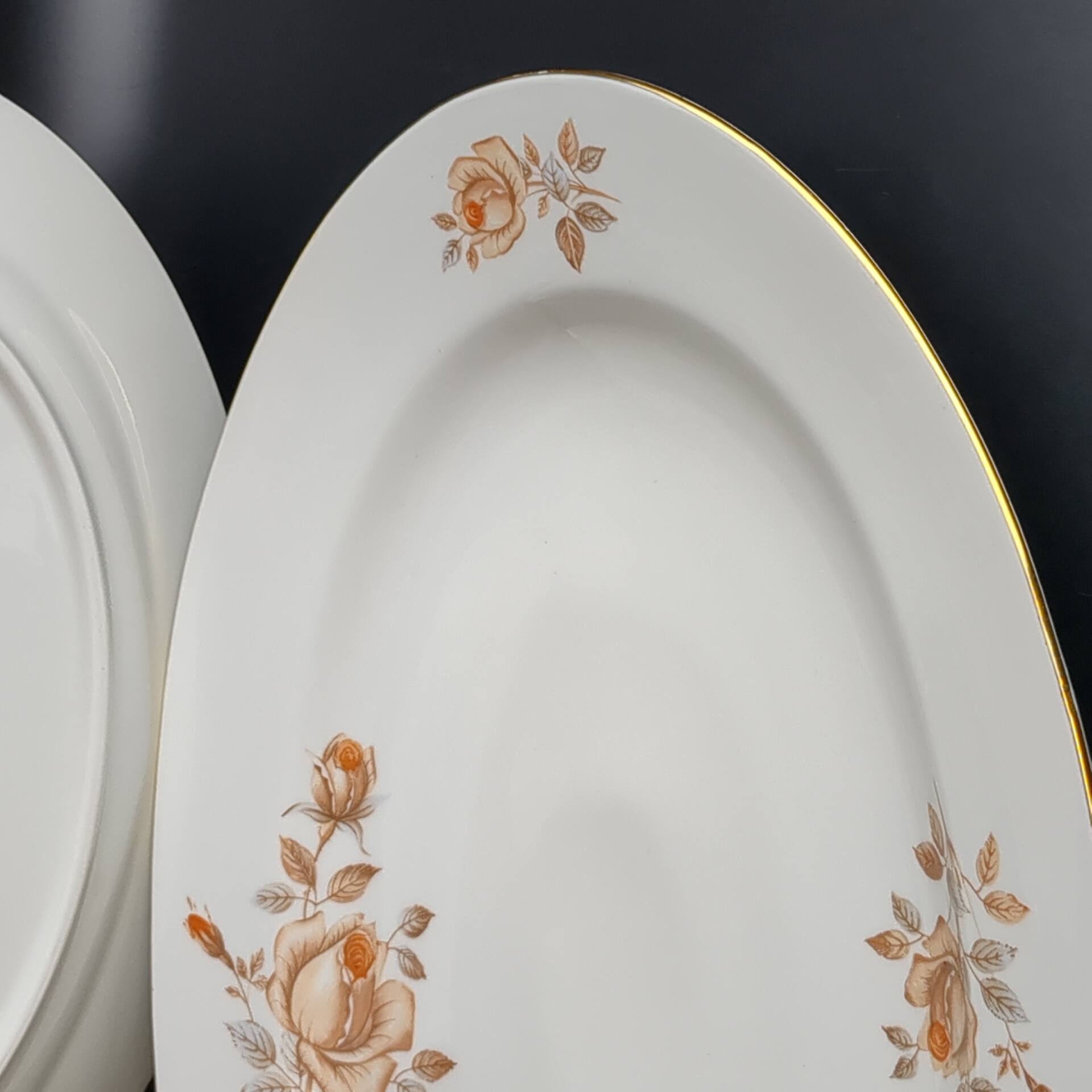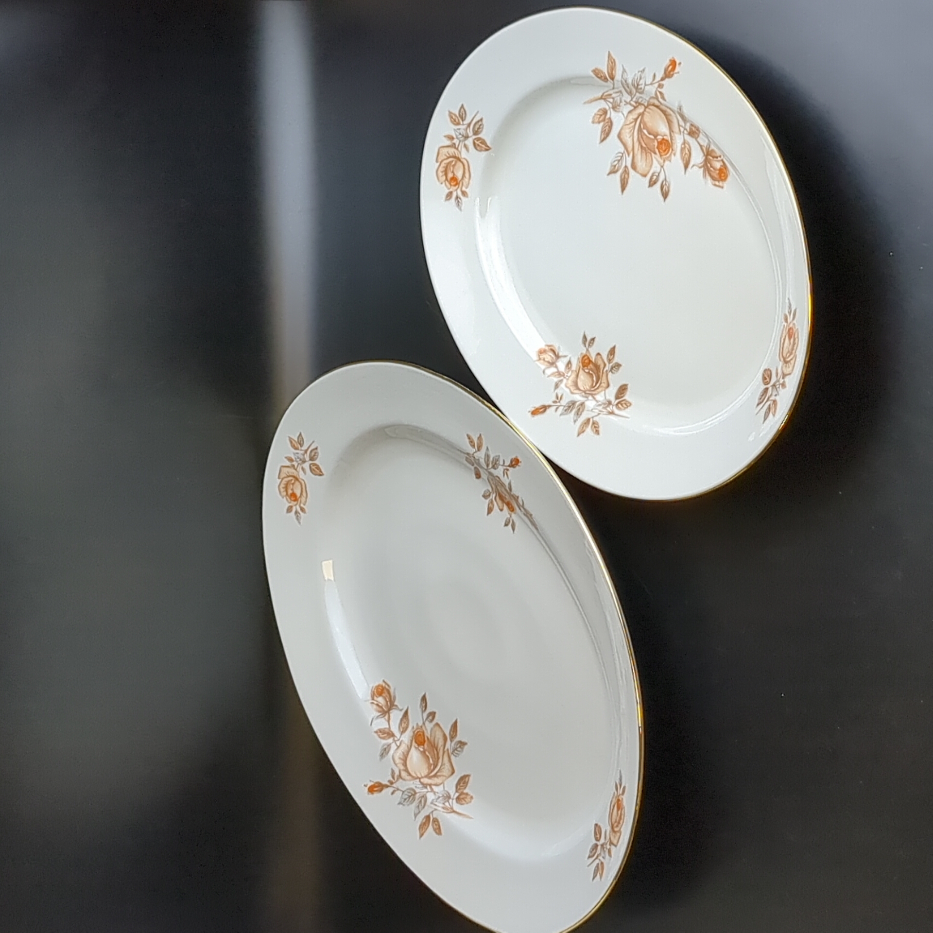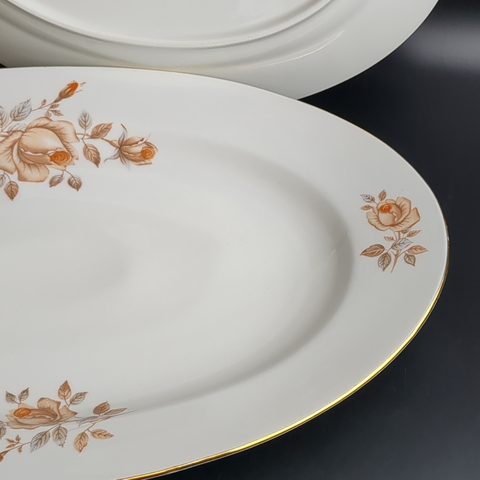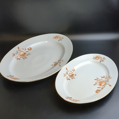 Блюда овальные для сервировки 2 штуки разных размеров, фарфор, роспись, из сервиза "Коралловая роза", золочение, EPIAG D.F Чехословакия, винтаж времен СССР 1960-1990 гг. Длина первого блюда - 38 см, длина второго блюда - 32 см.