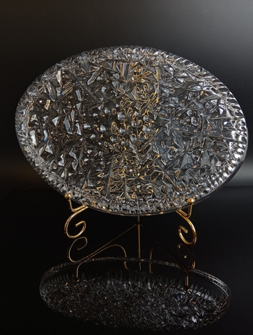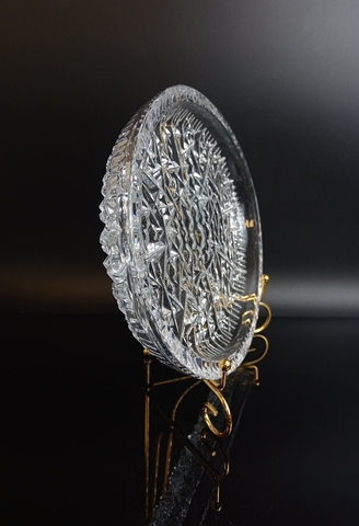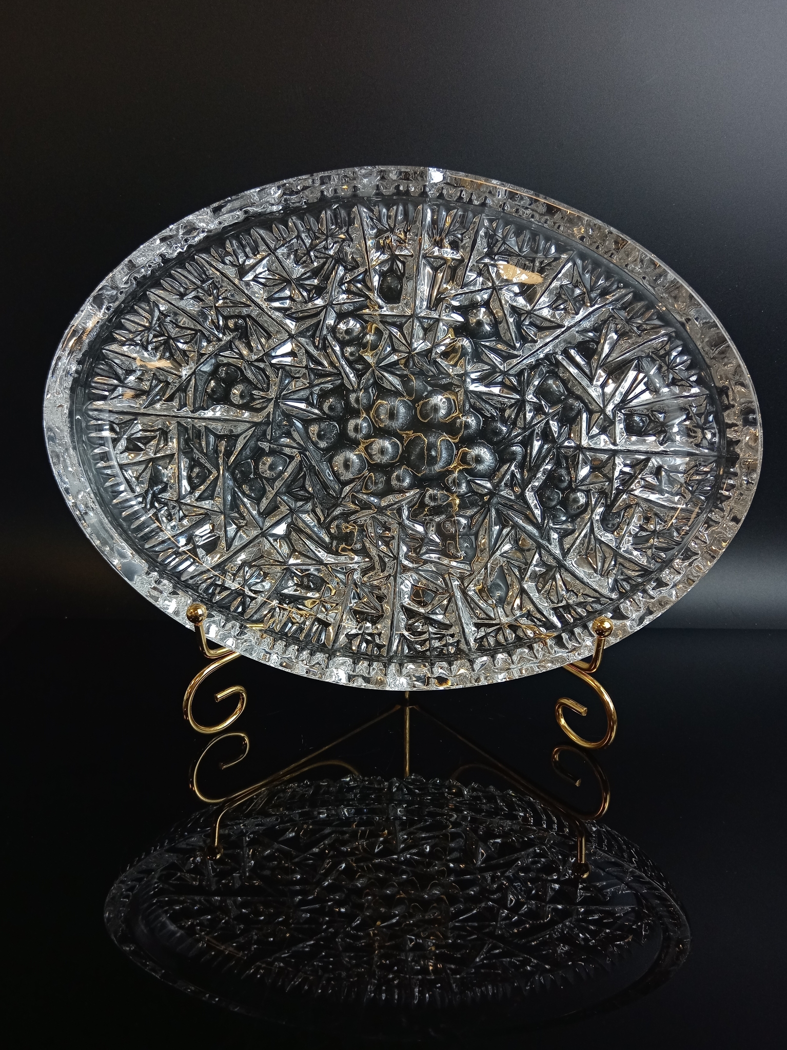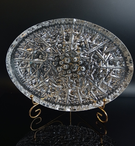Блюдо винтажное сервировочное Космос, хрусталь, автор Л.Д.Смирнова, пресс, Ленингнрадский завод художественного стекла ЛЗХС, винтаж СССР 1960-1990 гг. Выоста - 3.5 см, длина - 27.5 см. Присутствуют следы использования - состояние на фото