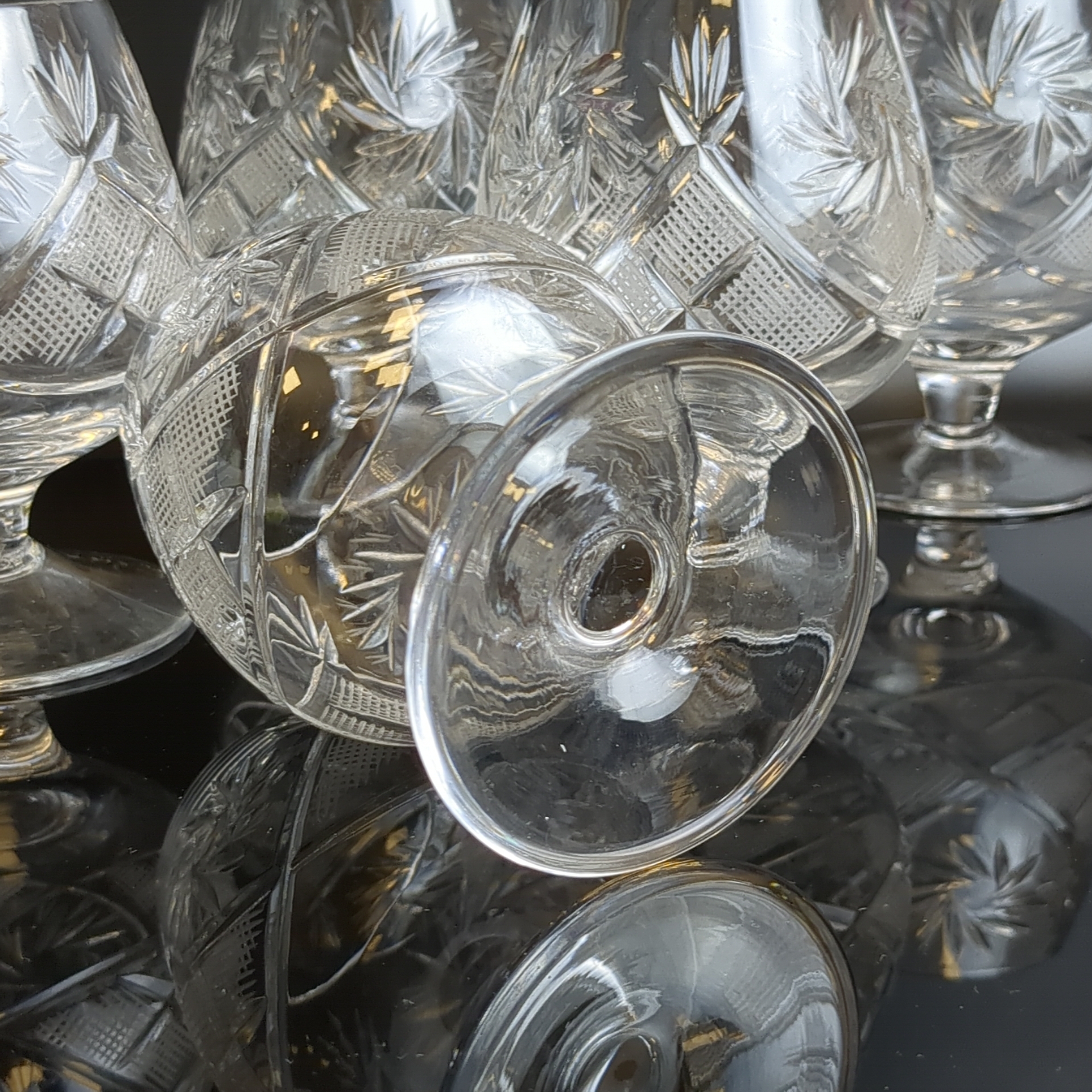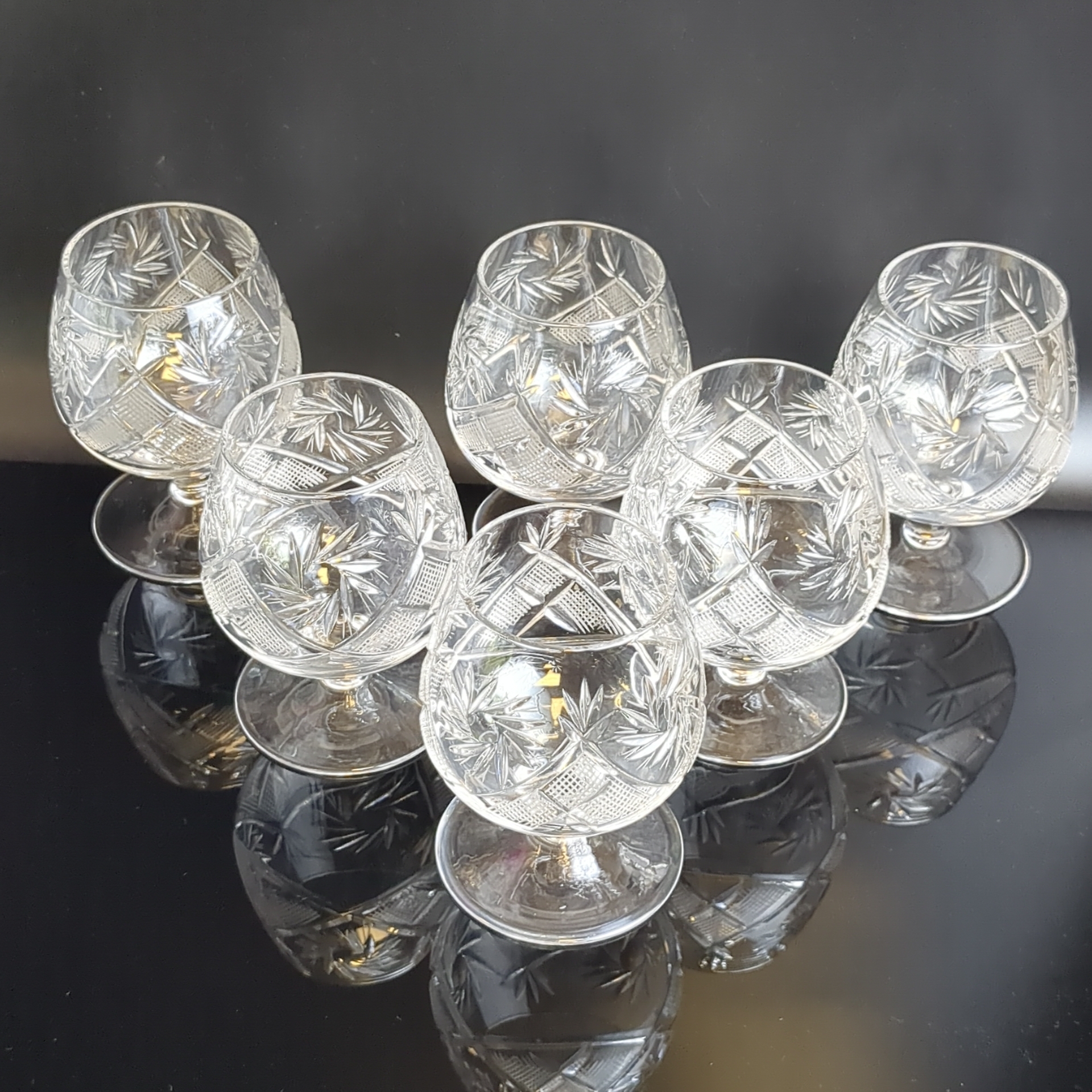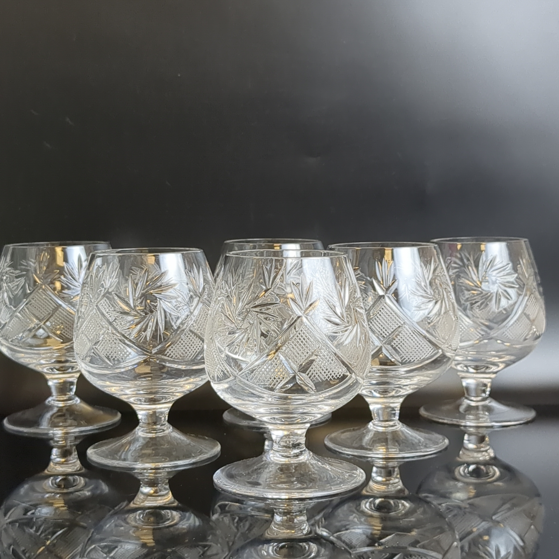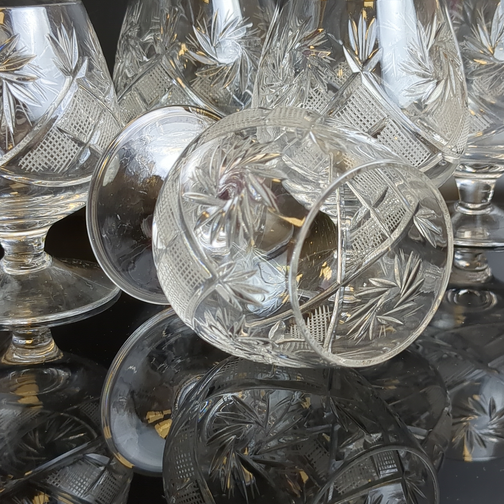Бокалы хрустальные набор из 6 штук для крепких напитков, алмазная грань, геометрический орнамент, матовый, (объём-? мл), винтаж СССР 1970-1990 гг. Высота - 11 см. Состояние на фото