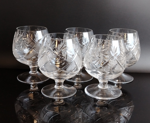 Бокалы хрустальные набор из 5 штук для крепких напитков, алмазная грань, геометрический орнамент, матовый, (объём-? мл), винтаж СССР 1970-1990 гг. Высота - 11 см. Состояние на фото