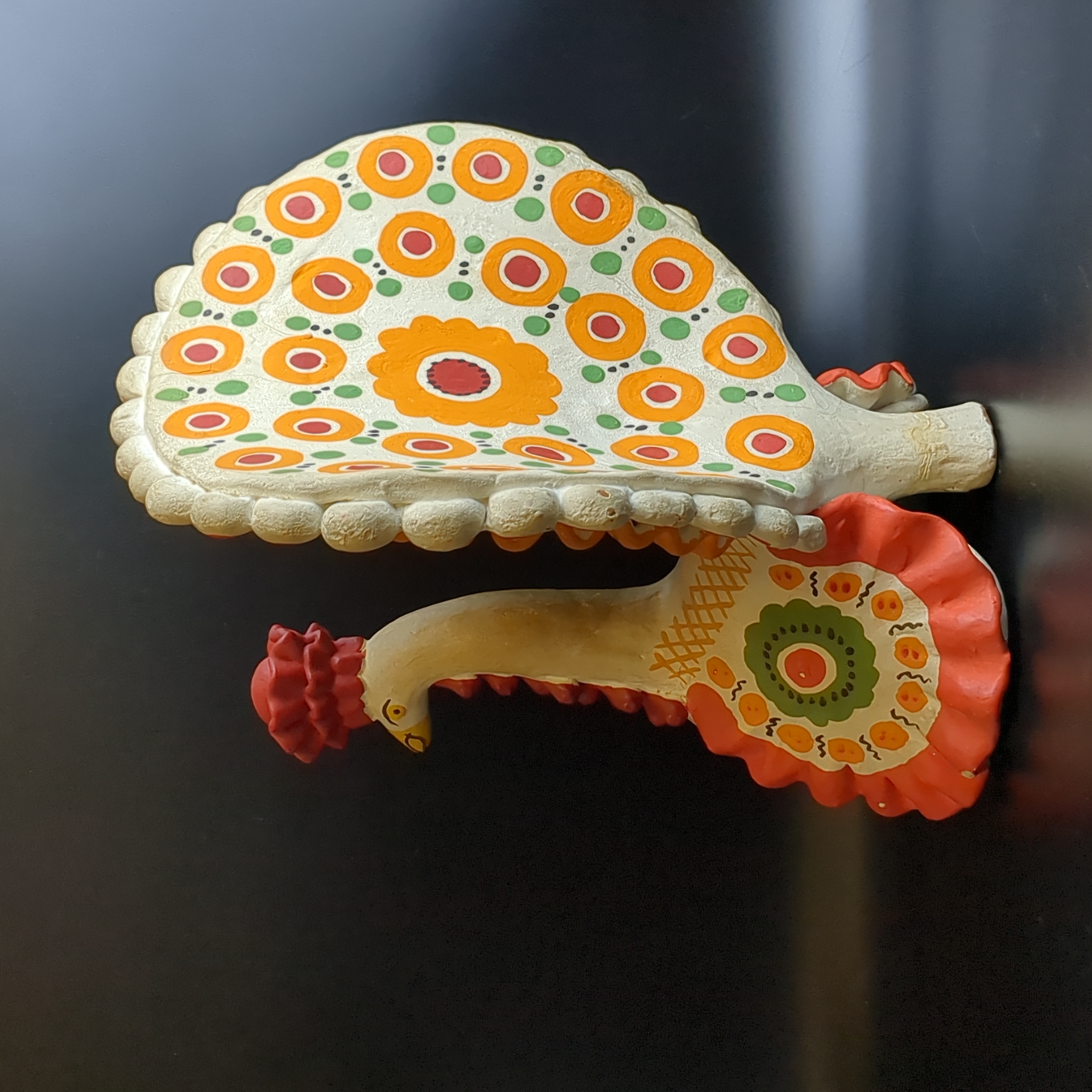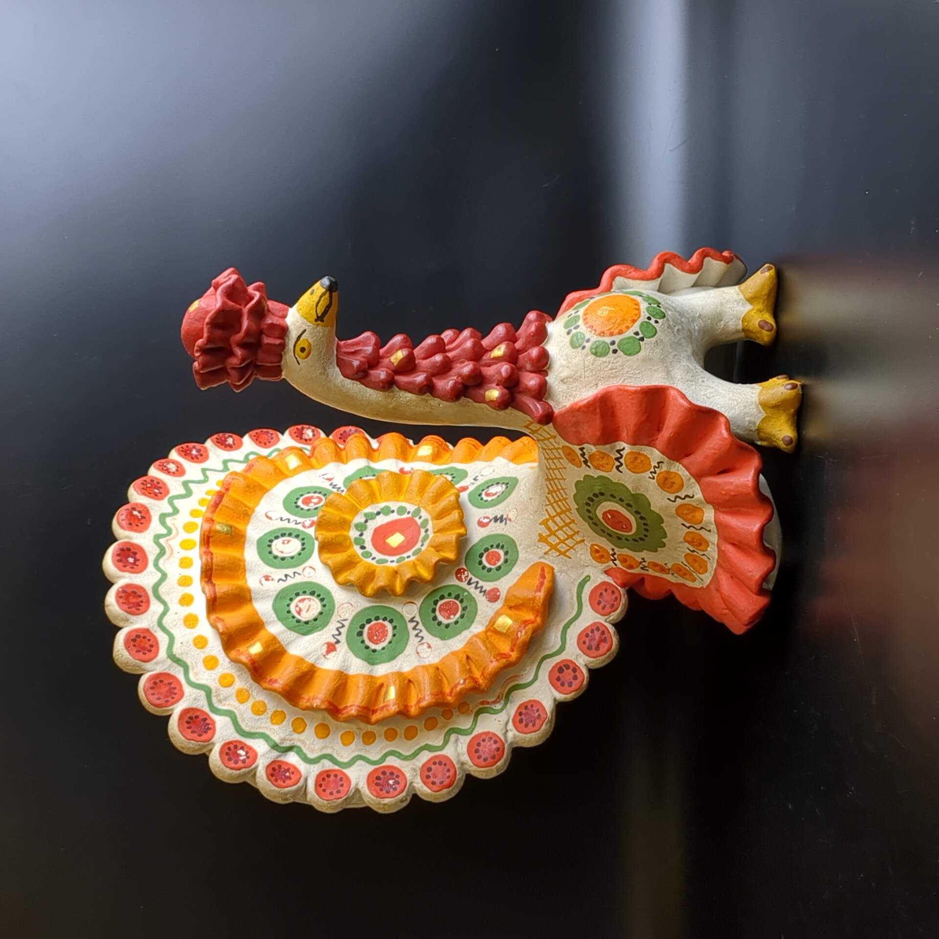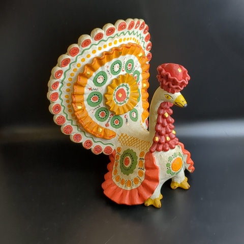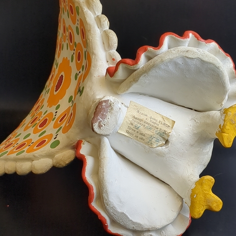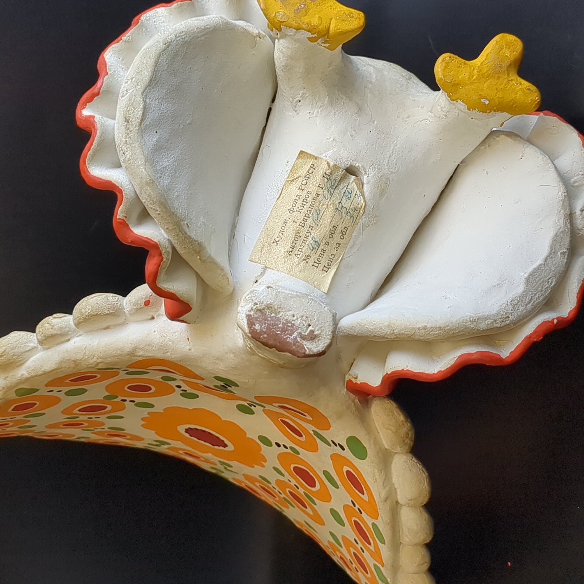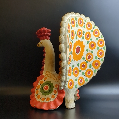 Статуэтка Большая авторская дымковская игрушка Индюк . Высота 29 см, ширина размаха хвоста 23,5 см, Автор Баранова Г.И. Шикарная ручная роспись, сусальное золото. Киров-Вятка, винтаж 1960-1980 гг. Баранова Галина Ивановна - Член ВТОО «Союза художников России» (1980). Родилась 10 марта 1942 года в г. Кирове.В промысле работает с 1958 года. Училась у З. В. Пенкиной, А. В. Кузьминых и Е. А. Смирновой. Мастерство мастерицы отмечено значком «За отличную работу» Министерства культуры СССР (1980). Дымковская игрушка – один из самых известных промыслов русской народной игрушки. Он возник в слободе Дымково Вятской губернии. Дымковскую игрушку лепят из красной глины, смешанной с просеянным речным песком. Дымковский индюк – это не просто игрушка, а символ народного творчества, олицетворяющий торжественность, богатство, плодородие и солнечную радость, с яркой, геометричной росписью (круги, полоски). Сервантное хранение, присутствуют следы использования, небольшие скольчики - состояние на фото