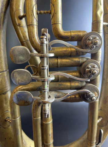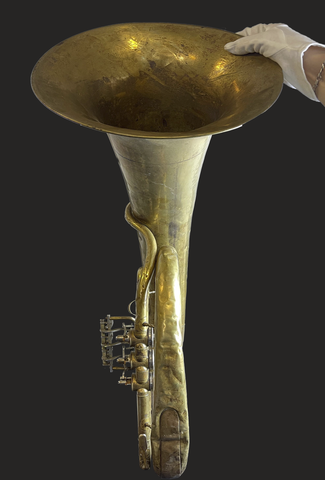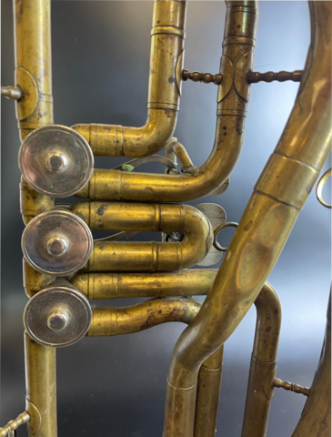 Труба оркестровая, туба духовая. Винтаж СССР. Антуражная для интерьера. Латунь. Альт, тенор, тромбон бартион? Имеются вмятинки. Состояние на фото. Длина 85 см.