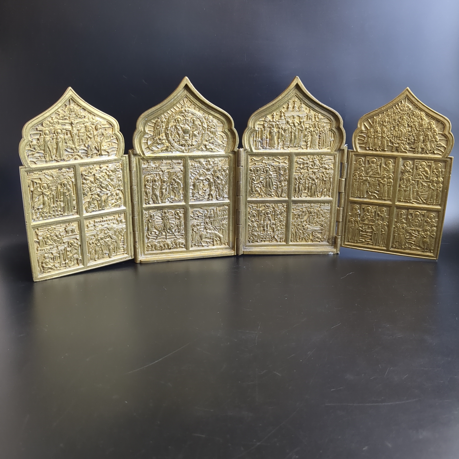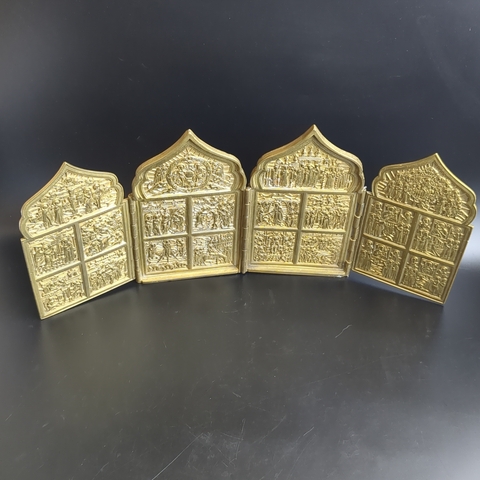 Большой старинный бронзовый четырехчастный Складень "Двунадесятые Праздники" (12 Православных Праздников) XIX век