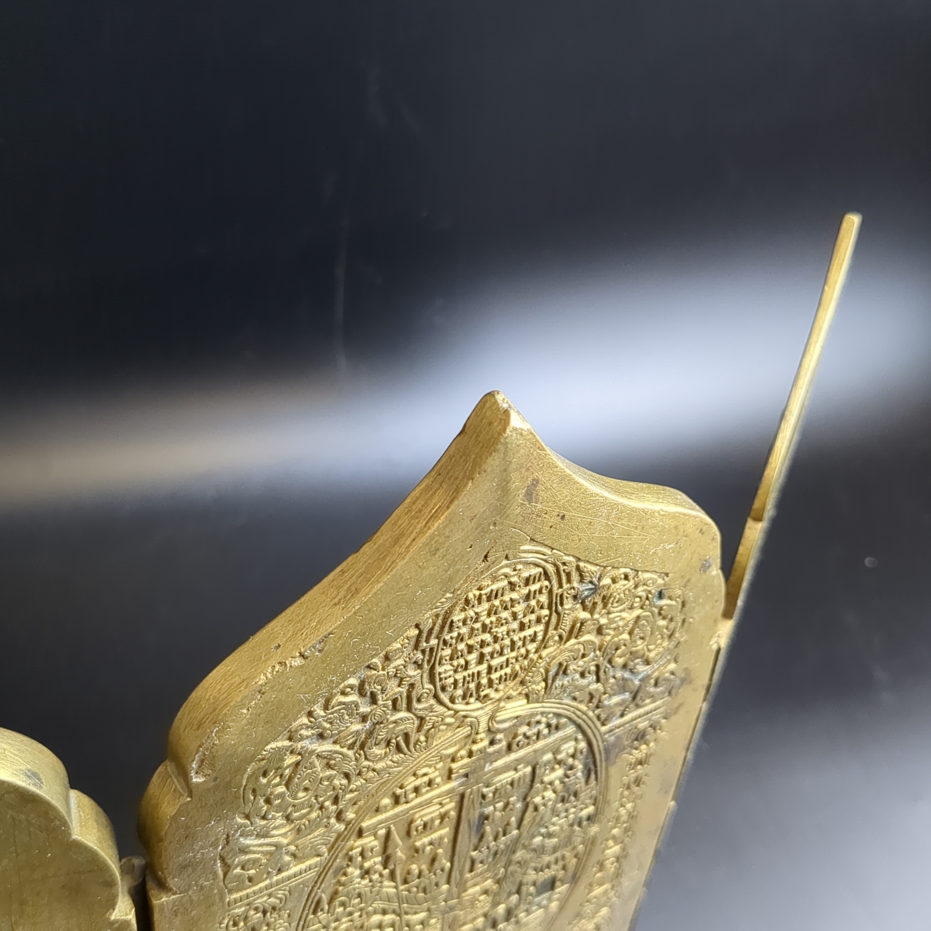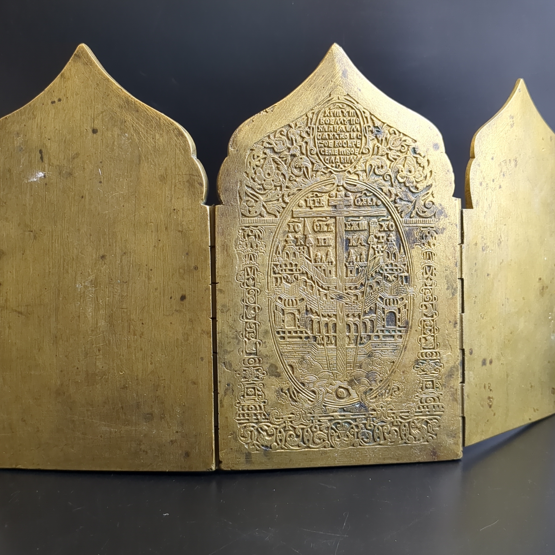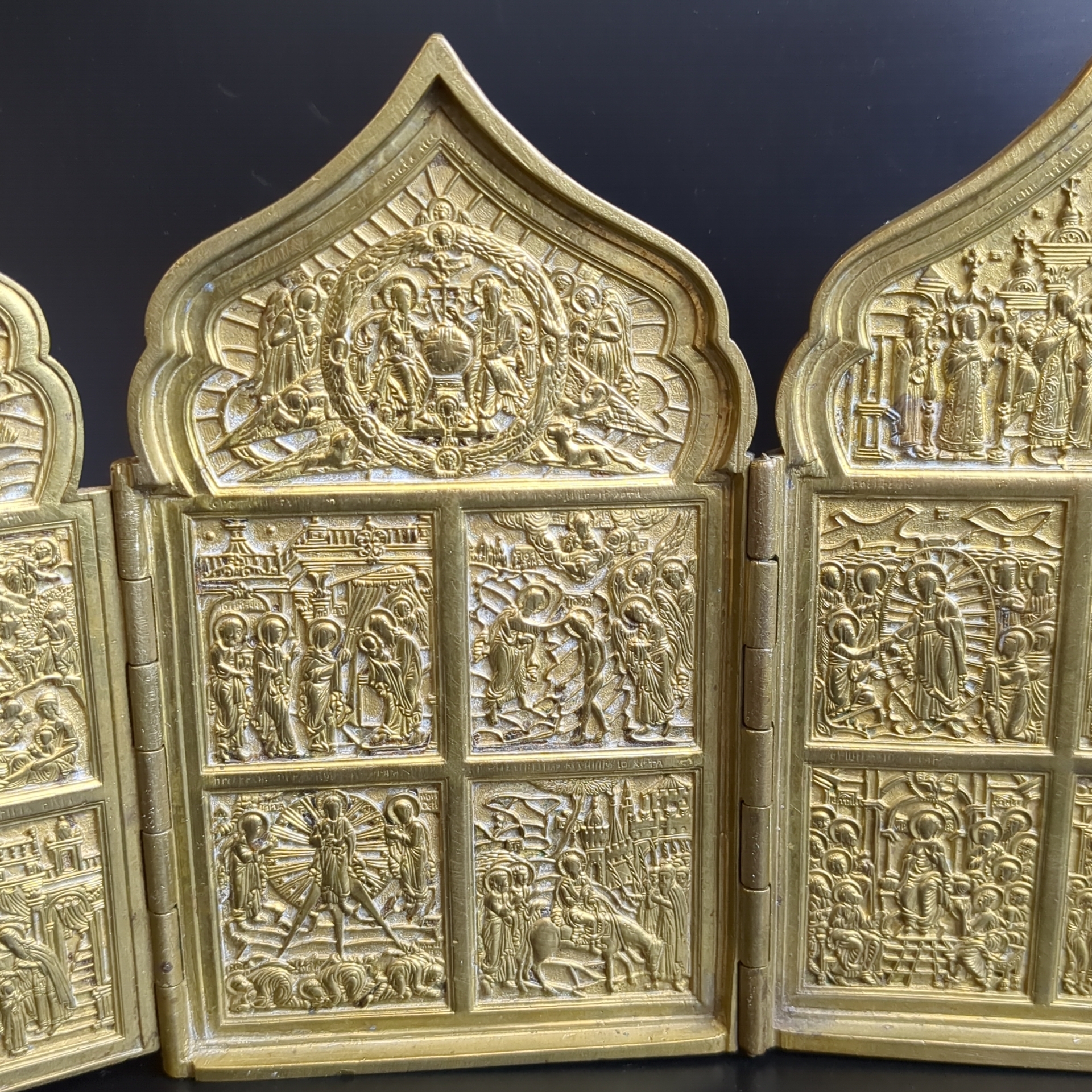 Икона складная. Большой старинный четырехстворчатый бронзовый складень (медный складень) 19 века. Двунадесятые Праздники (12 Православных Праздников) . Российская империя XIX век. Размеры 41 х 18 см. Вес 1,68 кг. Складень являлся переносным иконостасом, который удобно было взять с собой. На первой створке изображены: Навершие - Распятие Христово, в клеймах – Рождество Богородицы, Введение Богородицы во Храм, Рождество Христово, Благовещение. На второй створке изображены: Навершие – Троица Новозаветная, в клеймах – Вхождение Иисуса Христа в Иерусалим, Преображение Господне, Сретение господне, Богоявление (Крещение). На третьей створке изображены: Навершие – Воздвижение Креста Господня, в клеймах – Сошествие Святого Духа, Успение Пресвятой Богородицы, Воскресение Христово (Сошествие во ад), Вознесение Христово. На четвертой створке изображены: Навершие – Похвала Богоматери, в клеймах – Поклонение Смоленской иконе Божией Матери, Поклонение иконе Божией Матери Знамение, Поклонение Тихвинской иконе Божией Матери, Поклонение Владимирской иконе Божией Матери. Двунадесятые Праздники это самые важные 12 Праздников, отмечающихся православными христианами после наступления Пасхи. В дореволюционной России эти праздники отмечались не только, как церковные, но и как гражданские. Хороший плотный складень. Состояние на фото. Данная икона является культурной и исторической ценностью и не подлежит свободному перемещению через границу Российской Федерации согласно Закону РФ «О вывозе и ввозе культурных ценностей»