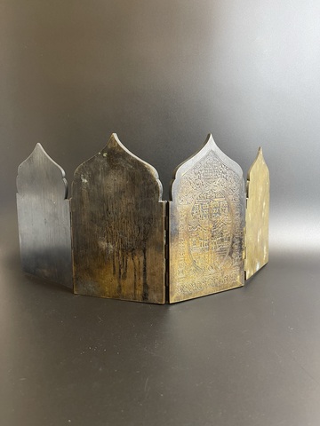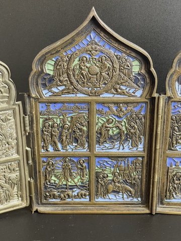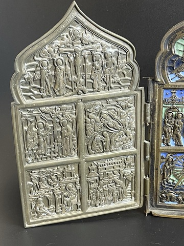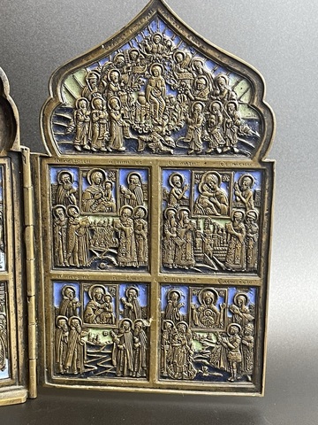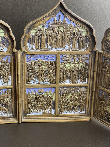 Икона складная. Большой старинный четырехстворчатый бронзовый складень (медный складень) 19 века. Двунадесятые Праздники (12 Православных Праздников) в горячих эмалях. XIX век. Размеры 41 х 18 см. Вес 1,25 кг.
