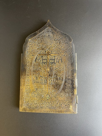 Складень являлся переносным иконостасом, который удобно было взять с собой. На первой створке изображены: Навершие - Распятие Христово, в клеймах – Рождество Богородицы, Введение Богородицы во Храм, Рождество Христово, Благовещение.