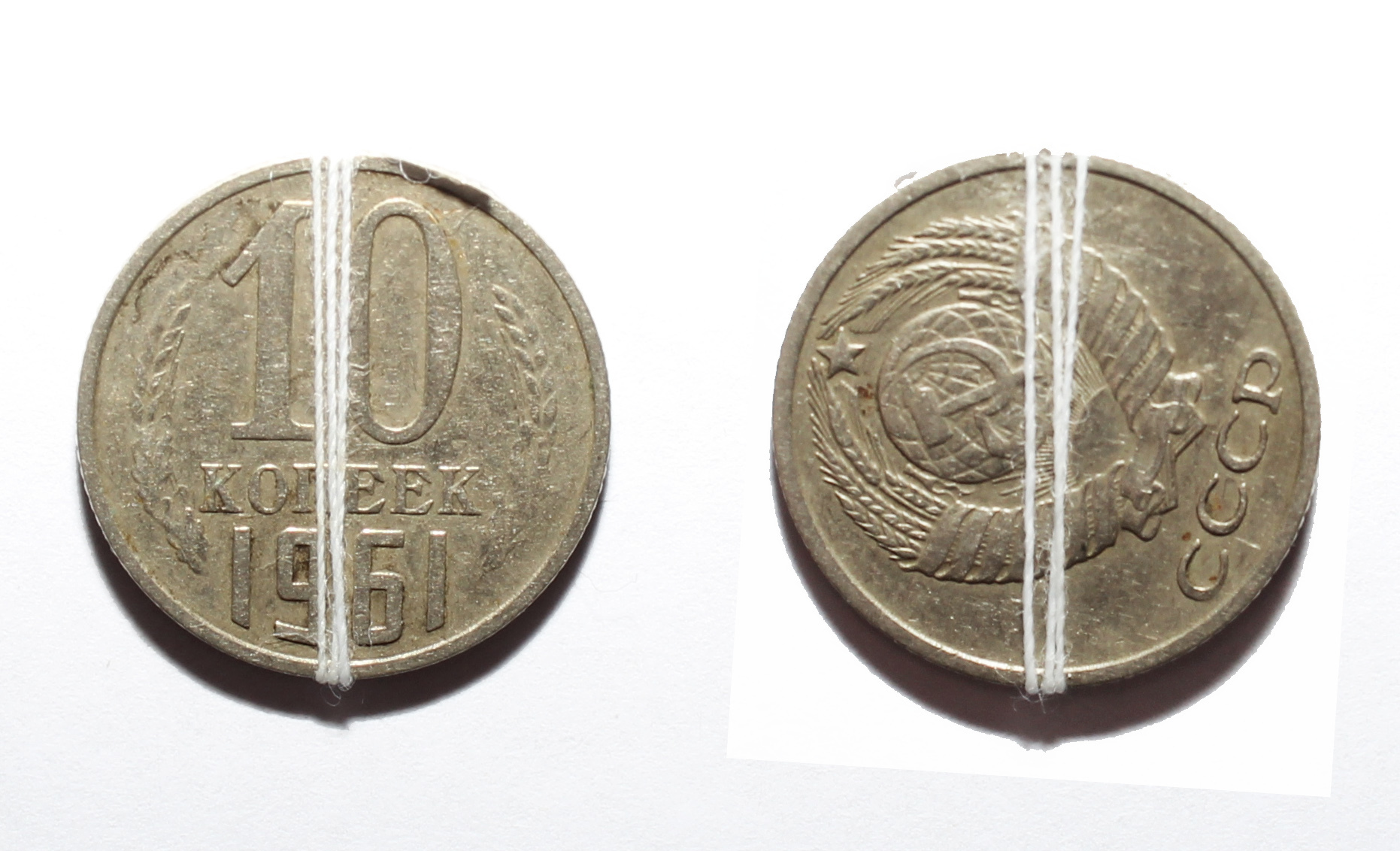 На реверсе вверху посередине присутствует крупное число "10", указывающее номинал монеты, под ним более мелким шрифтом - горизонтальное слово "КОПЕЕК", отцентрированное относительно номинала. Ниже горизонтально указан год чеканки - "1961" (нижняя часть цифр отображена полукругом вдоль канта). В боковых частях поля монеты полукругом стилизованно изображены колосья пшеницы, дополненные внизу дубовыми листьями.