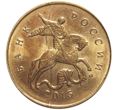 На аверсе изображён Георгий Победоносец верхом на коне, поражающий копьём змея. Данная фигура символизирует победу русского народа над злом. Под передним копытом коня - обозначение монетного двора, на котором отчеканена монета (М). Внизу поля монеты по окружности указан год чеканки - "2015", а вверху - надпись "БАНК РОССИИ", разделённая головой Георгия Победоносца на две части.