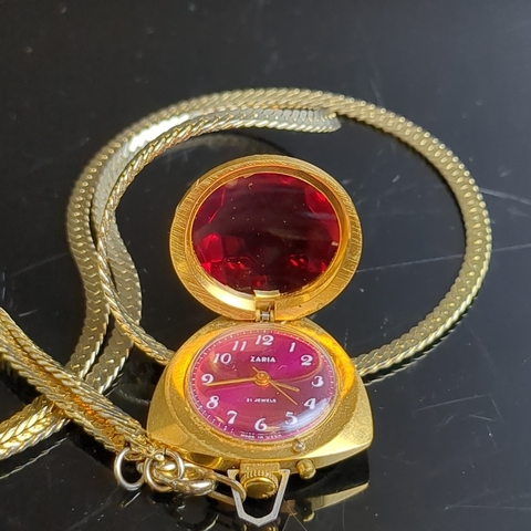 Часы - кулон. Механические женские карманные часы Заря 21 камень AU 5. СССР. Кулон на цепочке с красным крупным камнем. На рабочем ходу. Состояние на фото