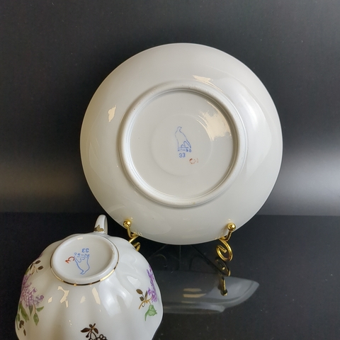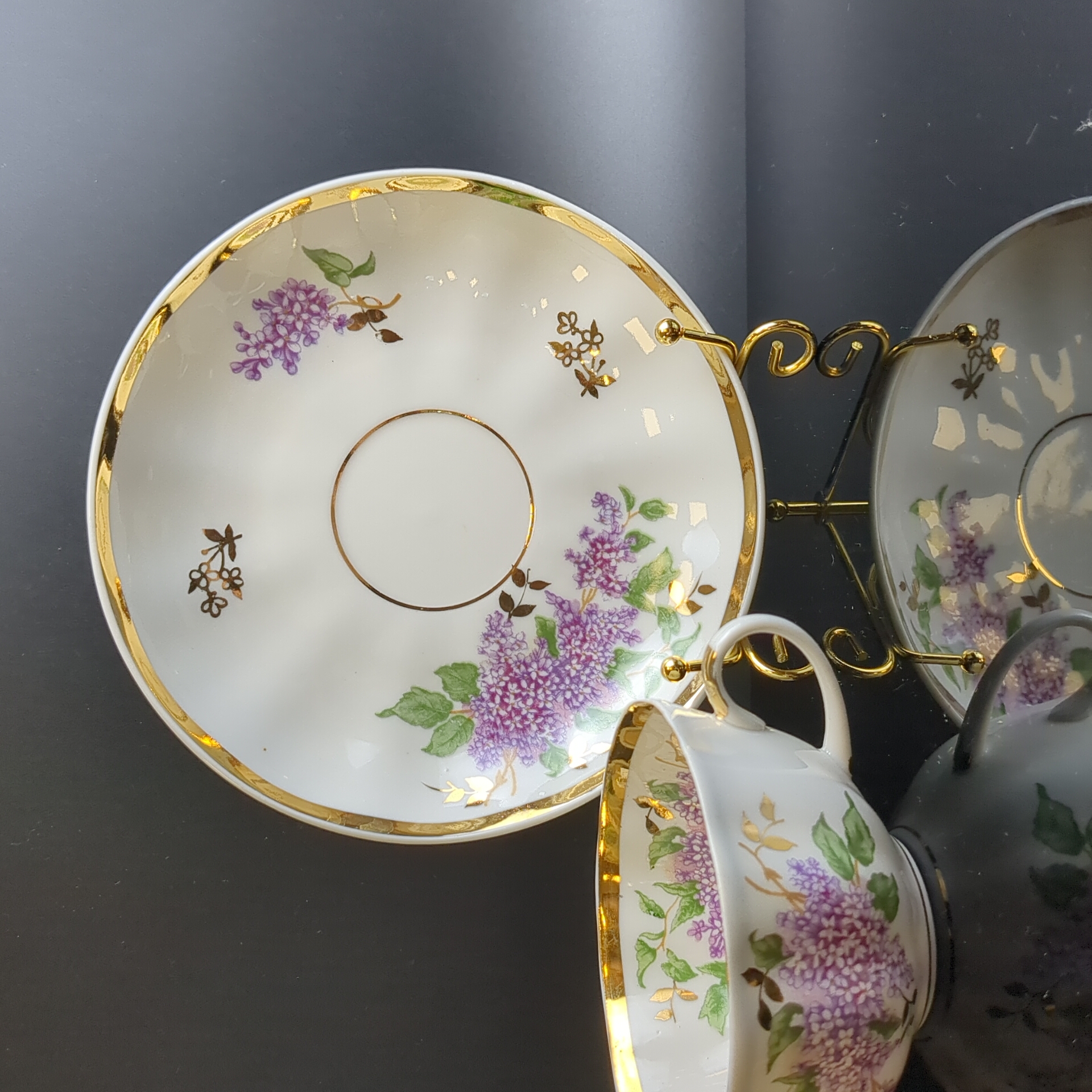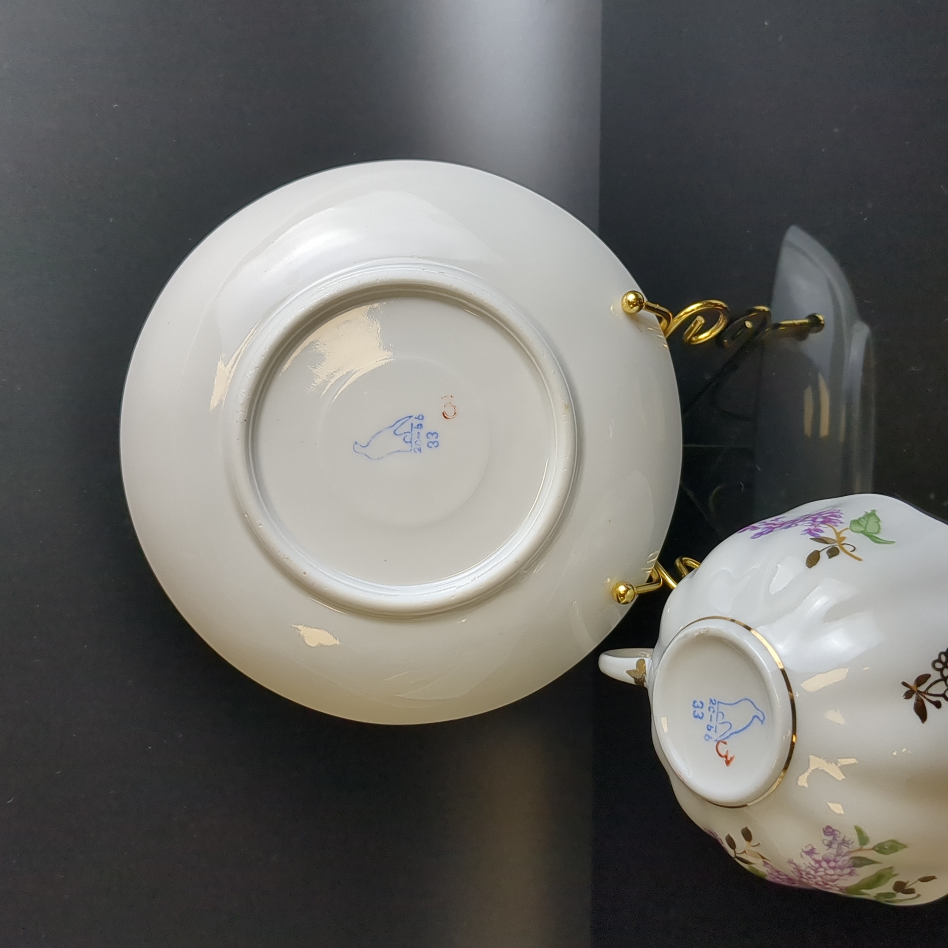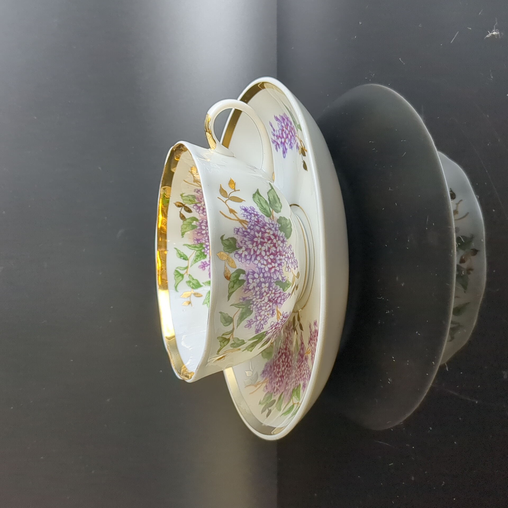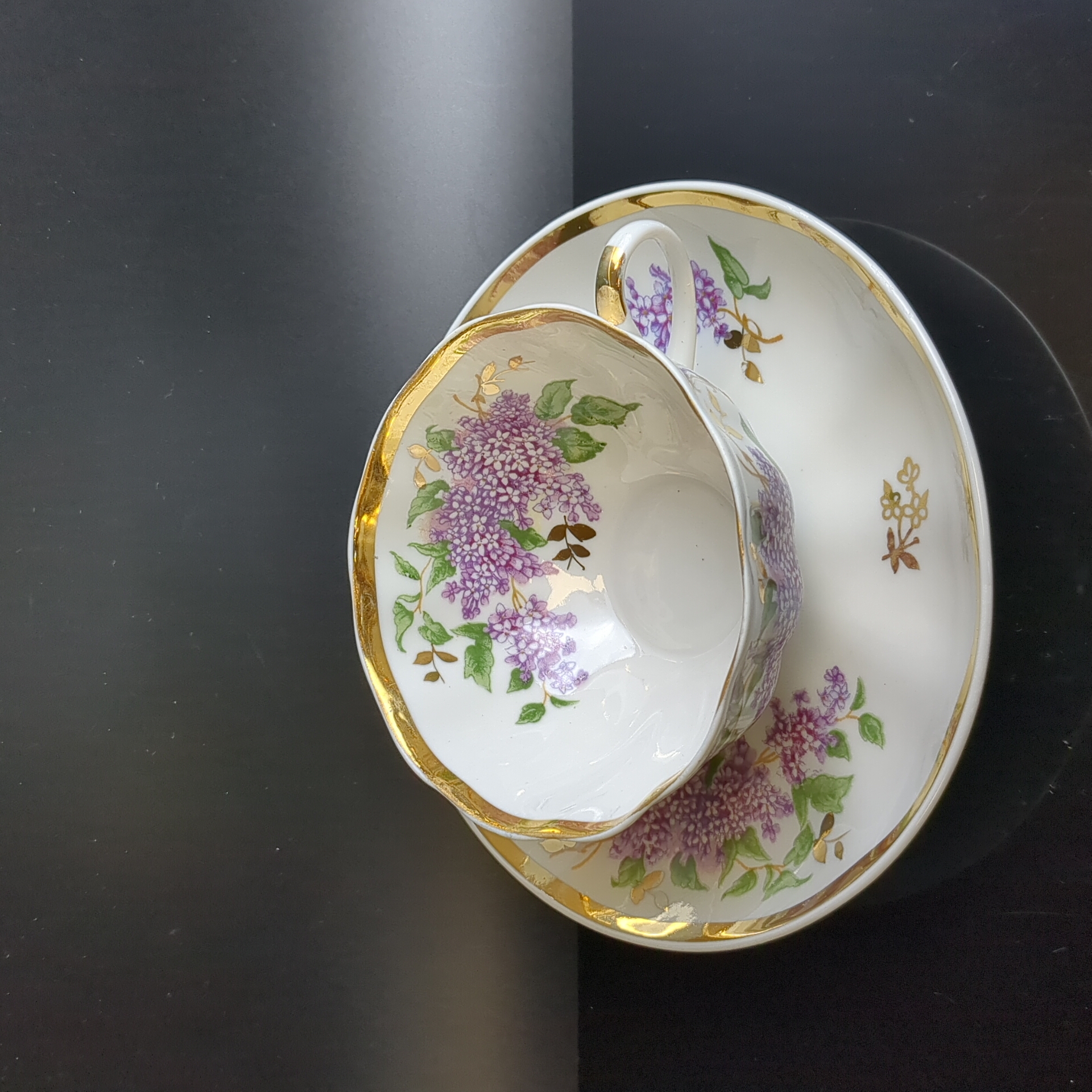 Фарфоровая чайная пара на одну персону с изящным декором цветов сирени, декор на внешней стороне и внутри чашечки, из периода СССР: винтажная роскошь в вашем доме! Высота чашечки - 5 см, диаметр блюдца - 15 см.