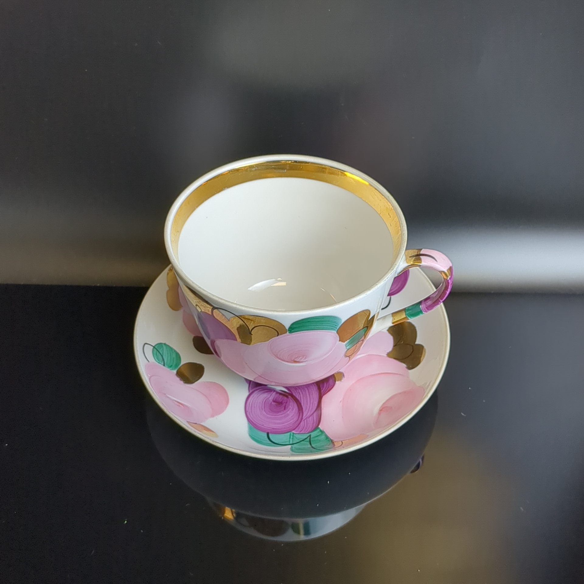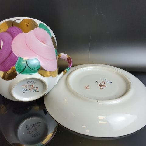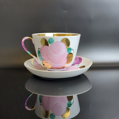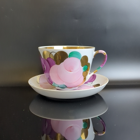 Чайная пара гигант фарфор Дулево ФЗ, красное клеймо, Агашки, роспись цветы ручная, позолота, винтаж СССР 1968-1991 гг.
