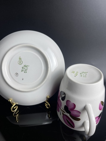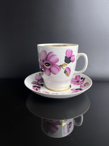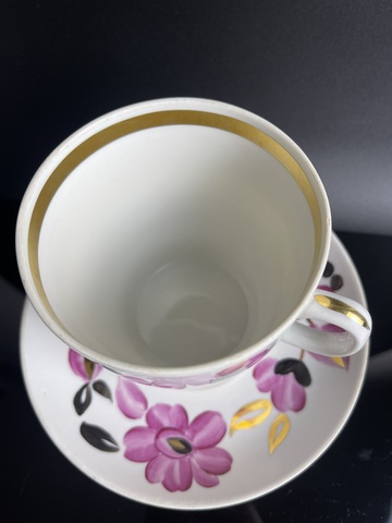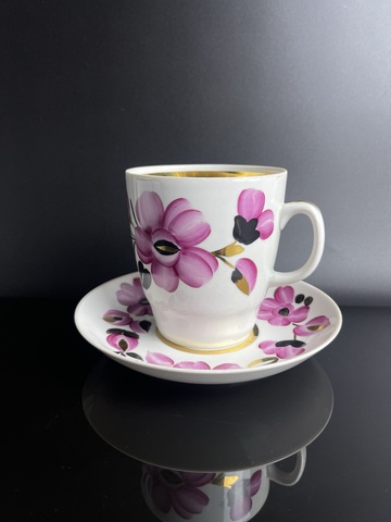 Чайная пара гигант клеймо Вербилки ДФЗ, фарфор, ручная роспись цветы, позолота, винтаж СССР 1960-1990 гг. Высота кружки - 10 см, диаметр - 9.5 см, диаметр блюдца - 16 см. Присутствуют незначительные следы использования - состояние на фото