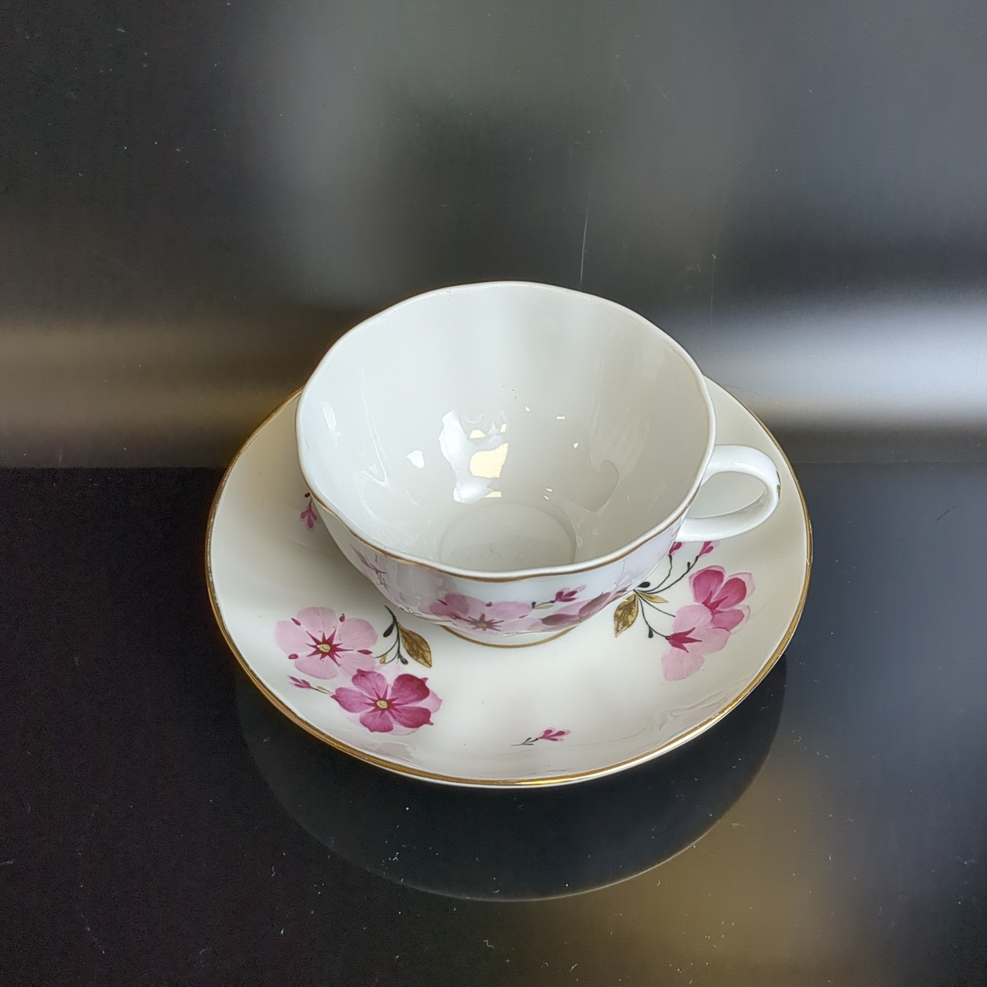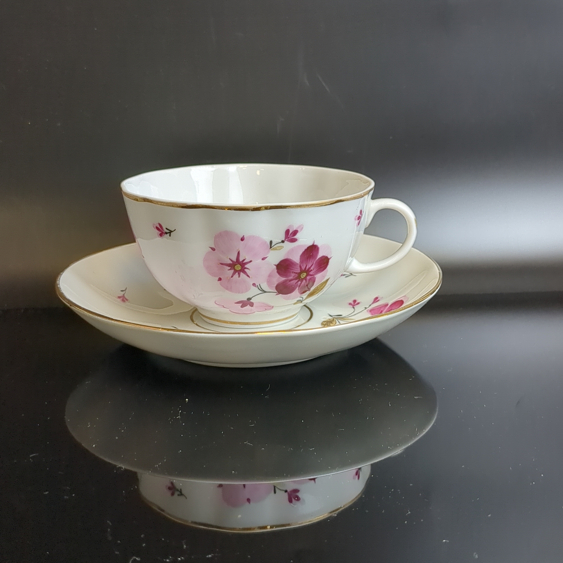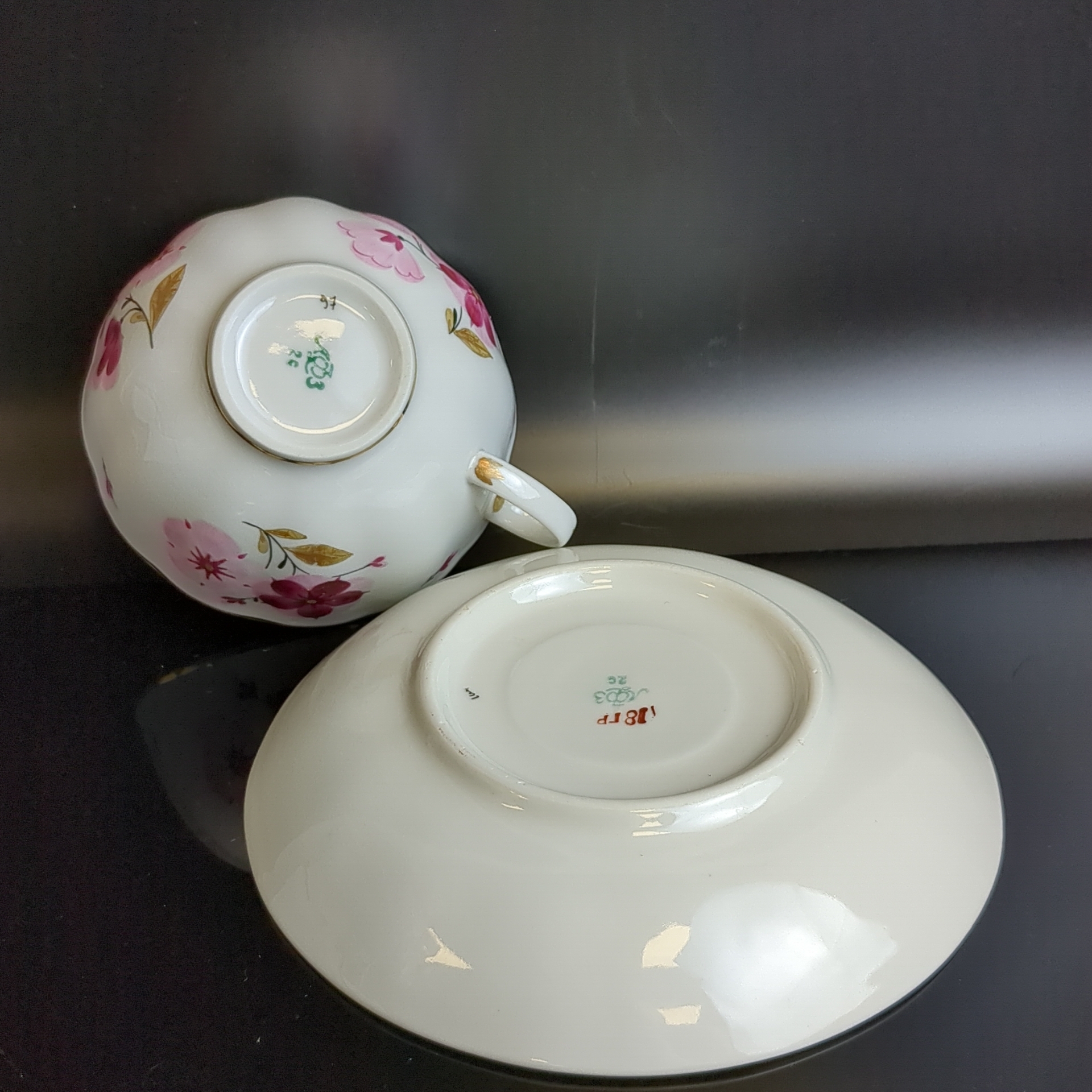 Чайная пара редкая ЛФЗ из сервиза "Майский ситчик", нежный рисунок цветов, Т.Н. Беспалова-Михалева ручная роспись, золочение, форма "старый" тюльпан, винтаж СССР 1960-1969 год. Ленинградский Фарфоровый Завод. Состояние на фото
