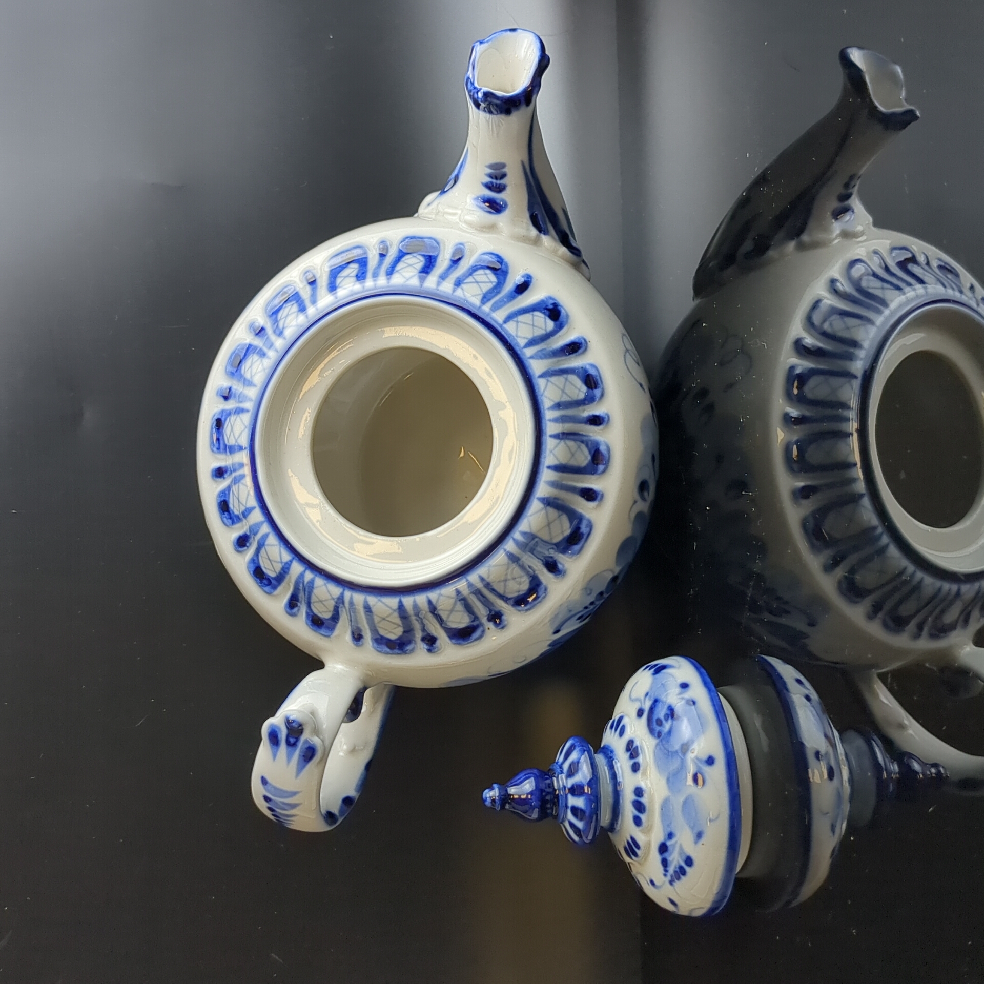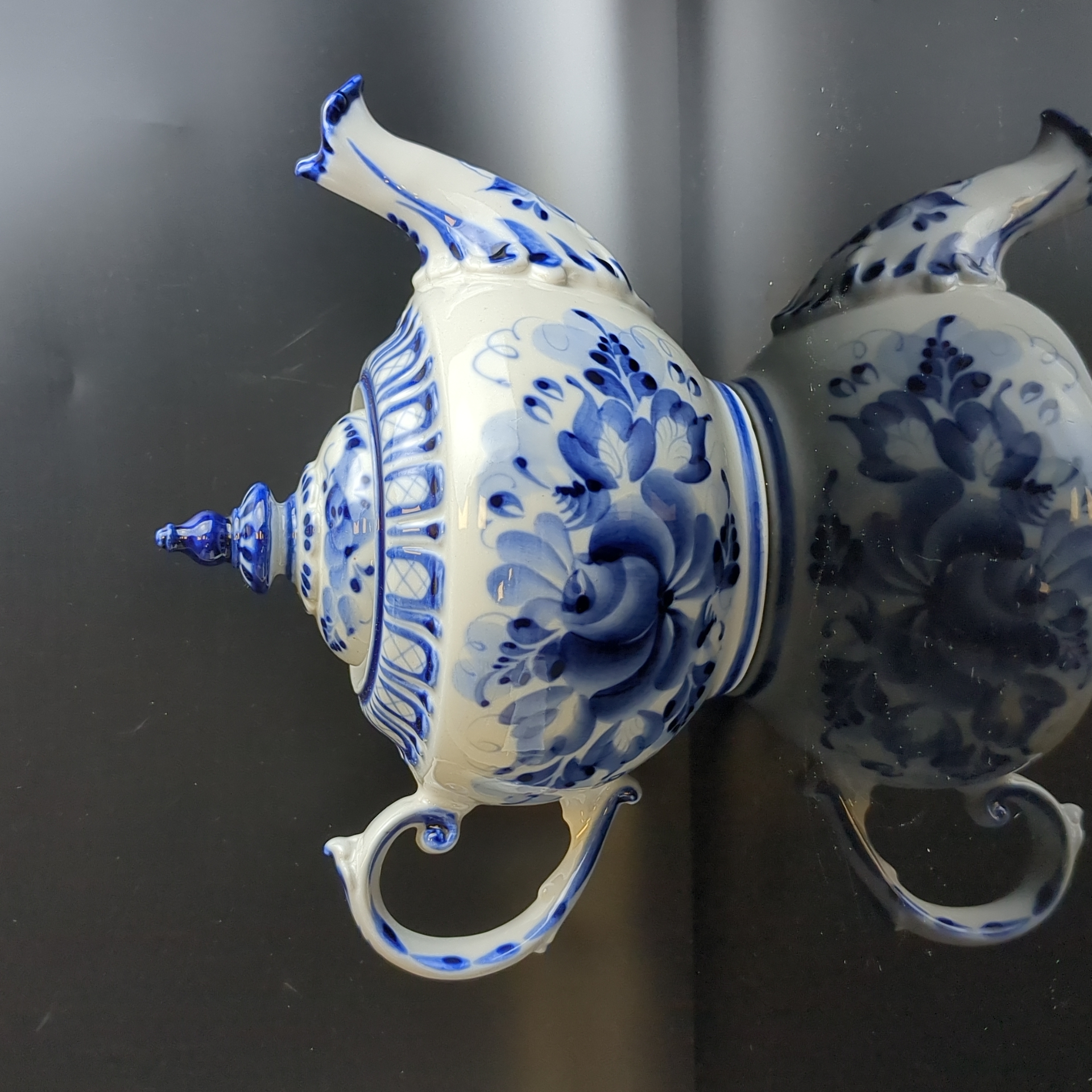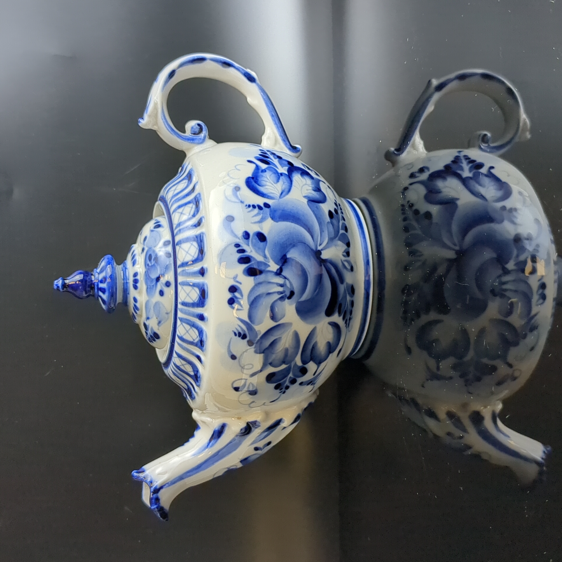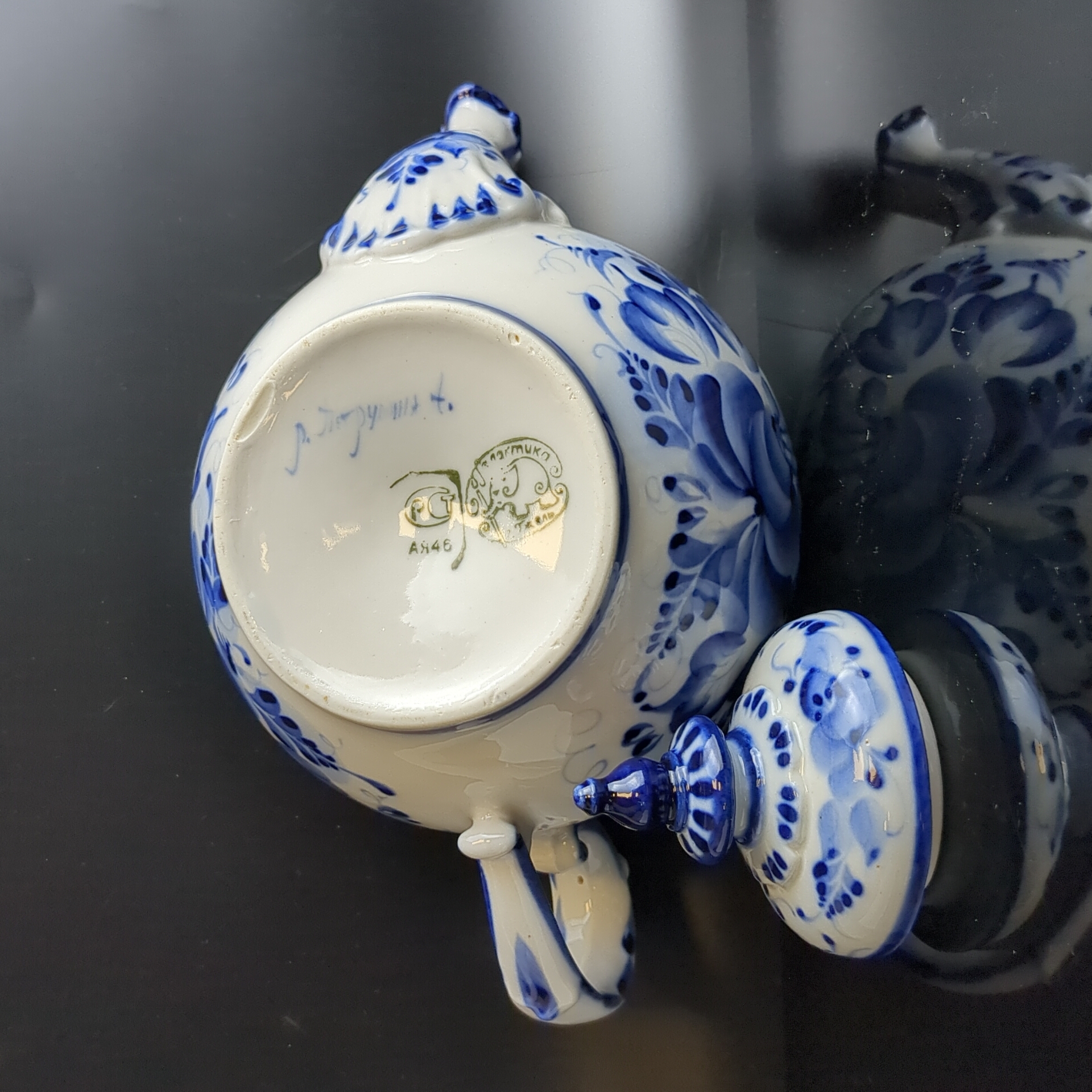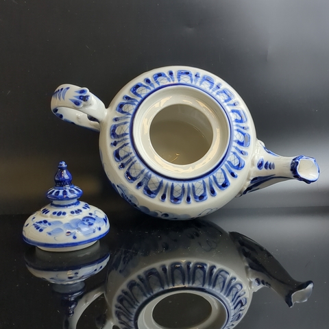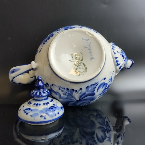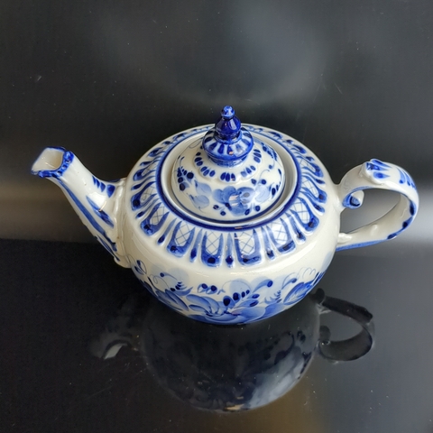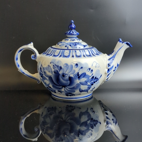 Чайник фарфоровый с росписью "Гжель", декор цветы, роза, автор А. Петрушина, клеймо, винтаж. Высота - 13.5 см. Состояние на фото