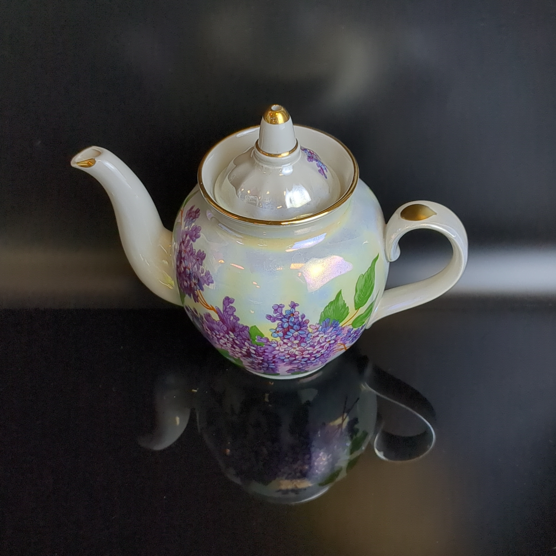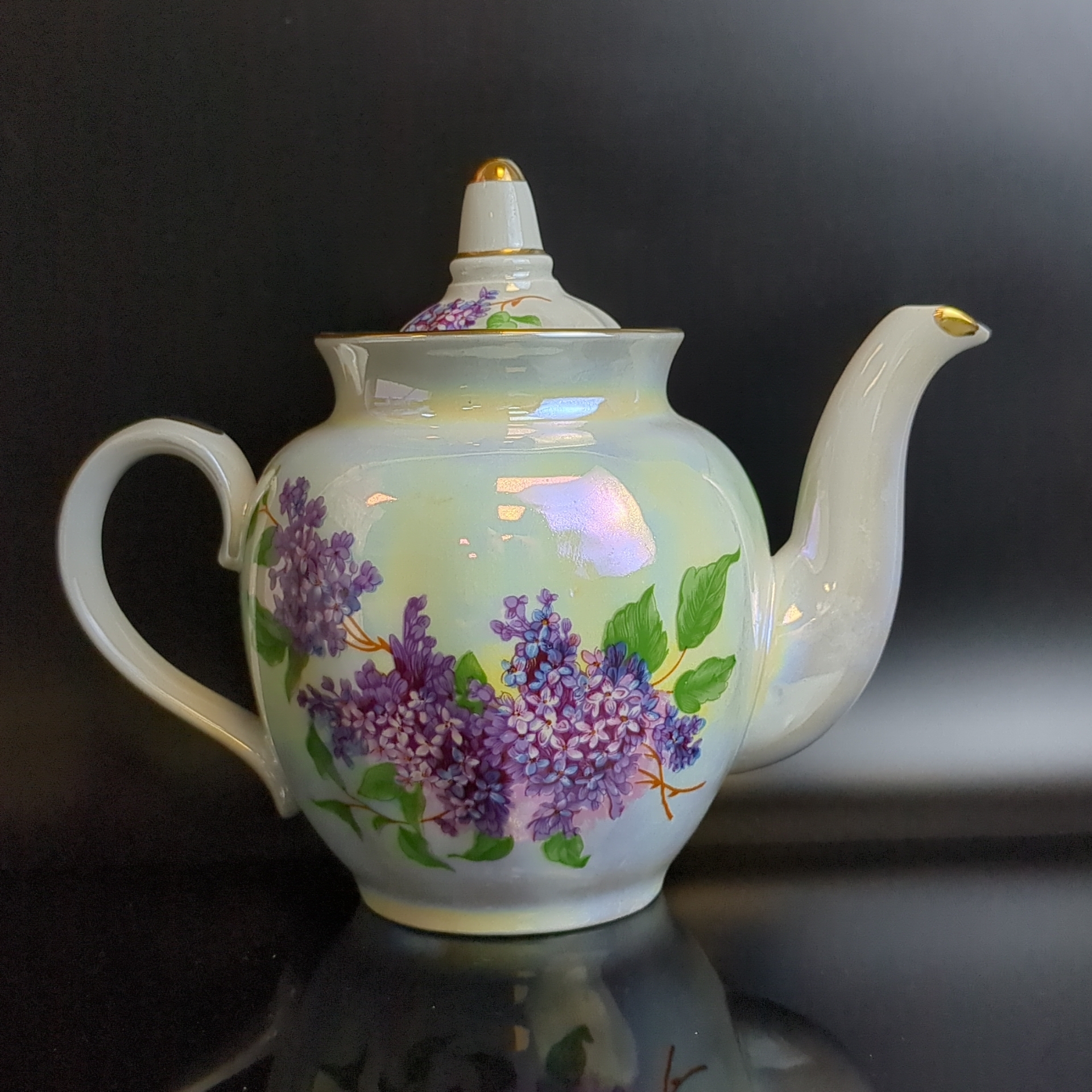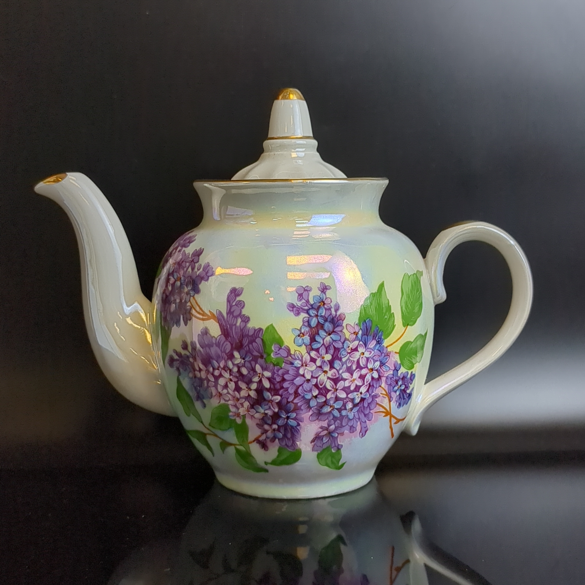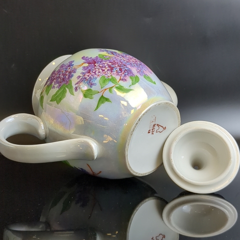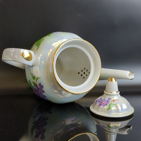 Чайник заварочный фарфоровый Дулево ФЗ из сервиза "Сирень", перламутр, позолота, (объём- ? мл) винтажный. Высота - 17 см. Состояние на фото
