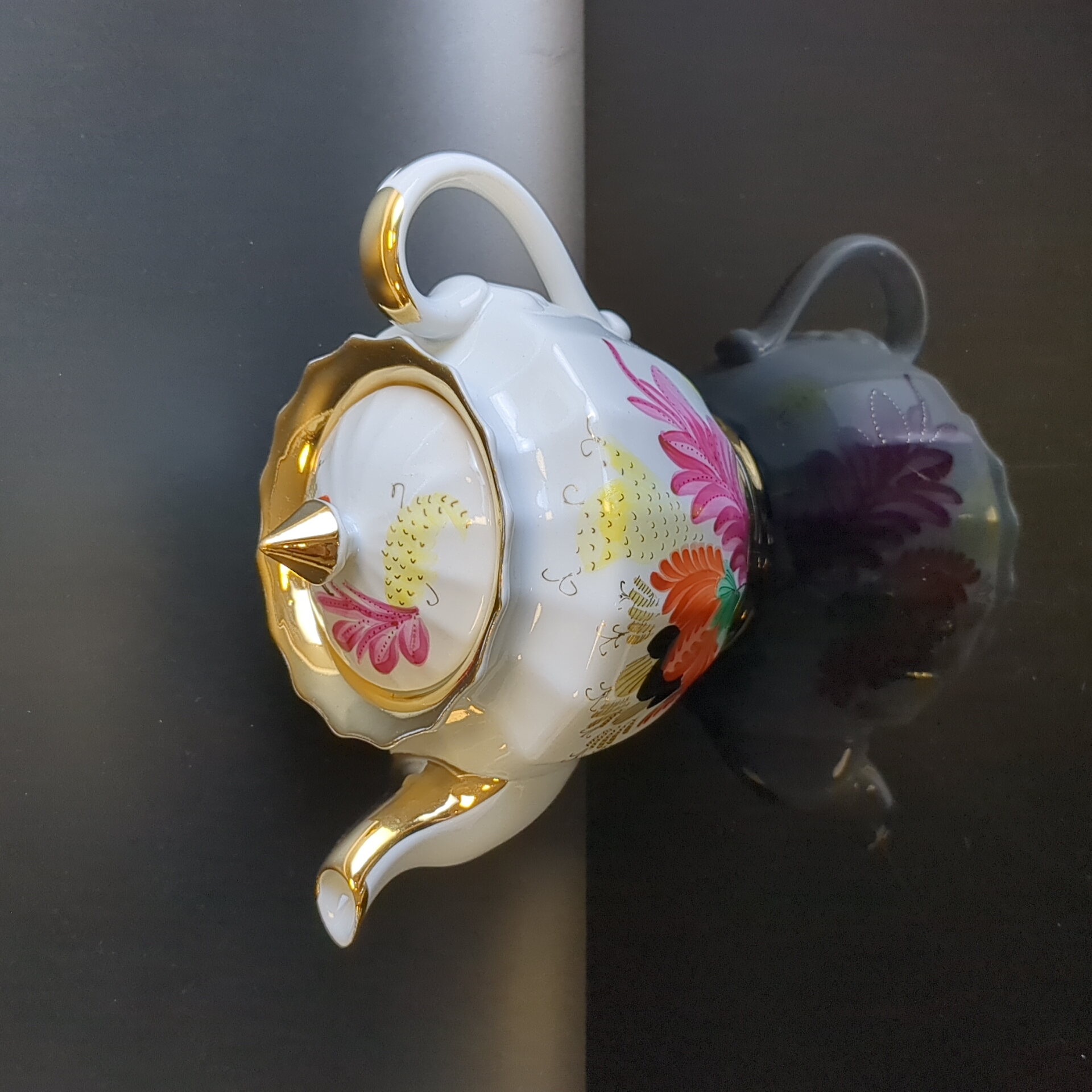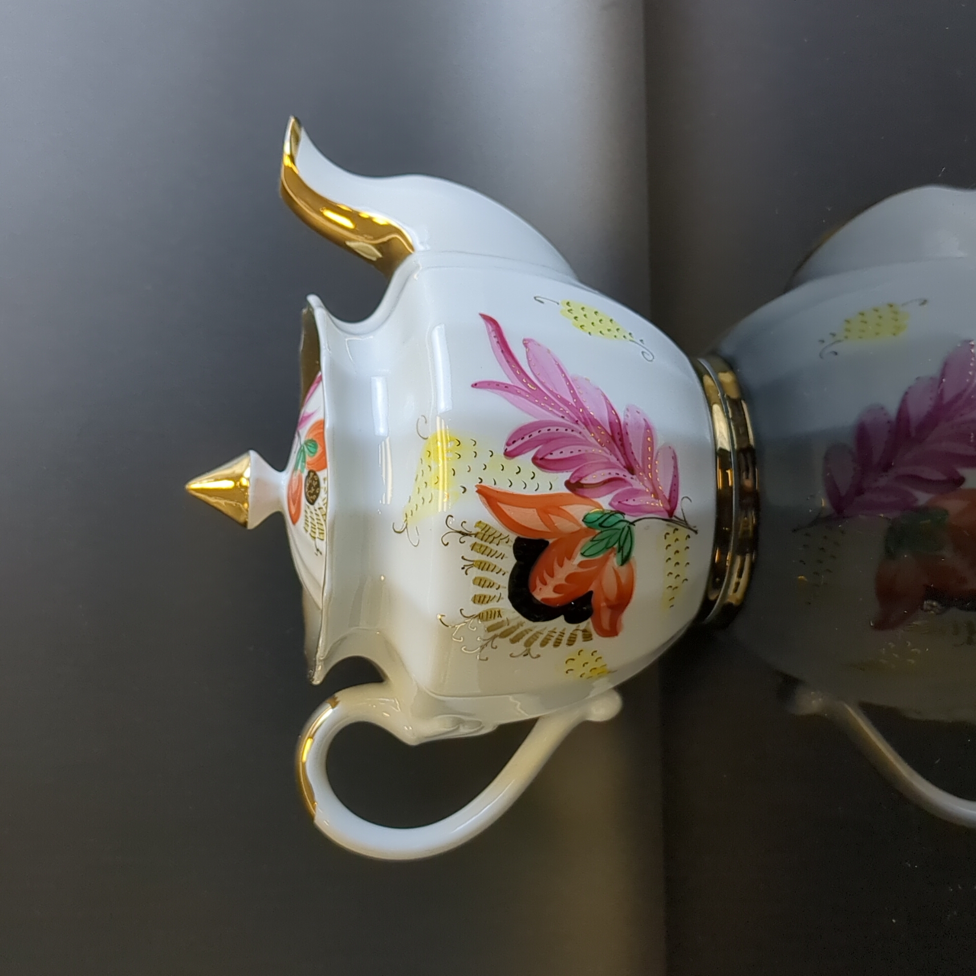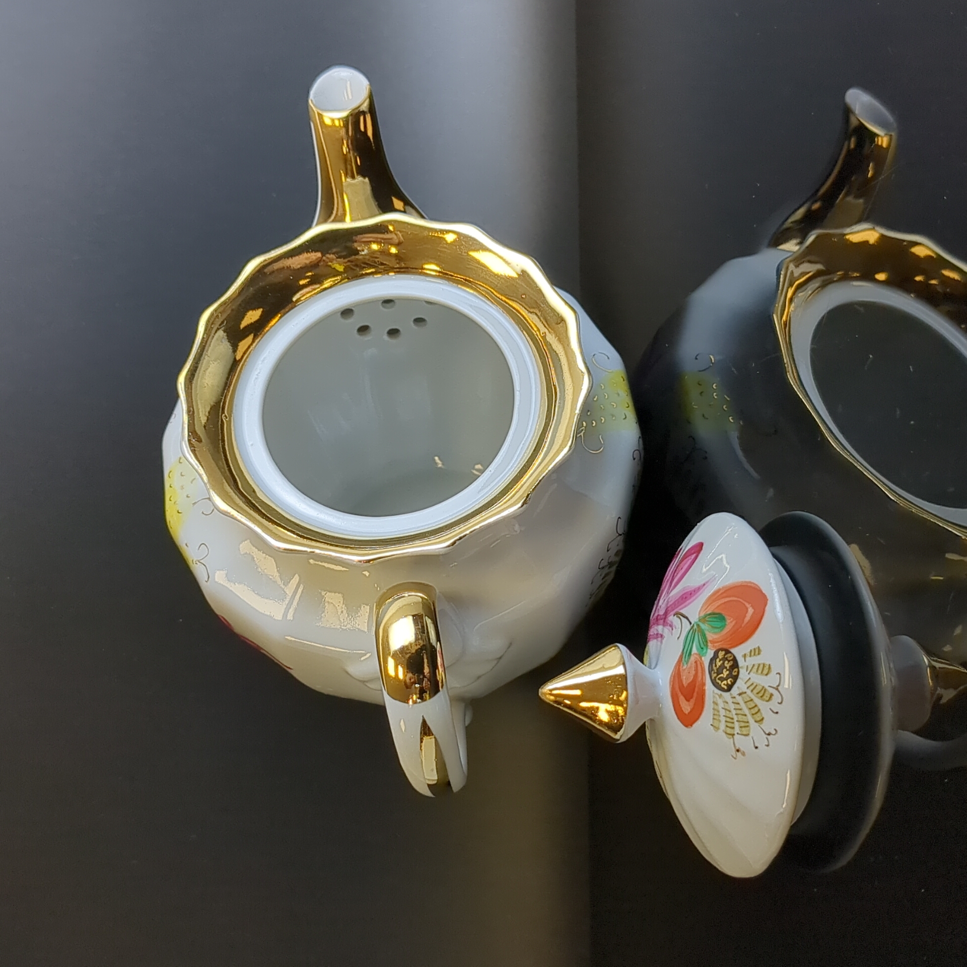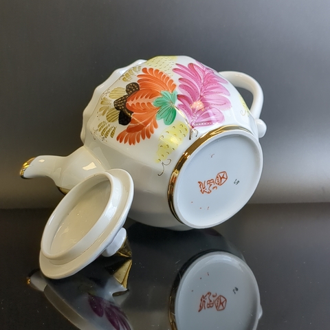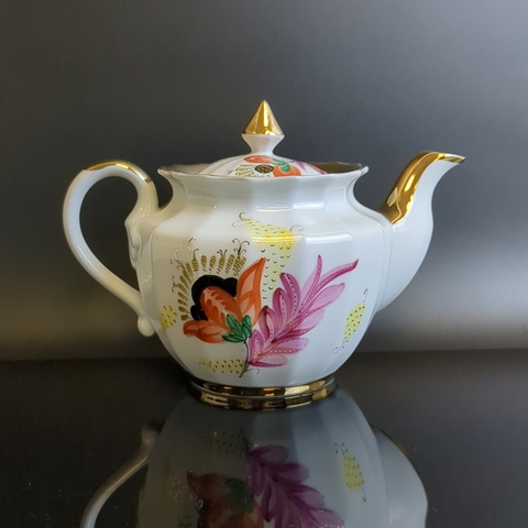 Завораживающее великолепие этого произведения искусства создал Смирнов Евгений Петрович, главный художник предприятия в период с 1940 по 1980 год. Он удостоен Государственной премии имени Репина и принял участие более чем в 150 выставках в Советском Союзе и за его пределами. Посуда отличается изяществом и роскошью. Широкие золотые полосы украшают "горлышки", ручки и основания, а красочный декор, обрамленный позолотой, придает ей торжественный и эффектный вид. Посуда функциональна и предназначена для повседневного использования. Это яркий акцент для чайного стола, кухни и коллекции винтажных антикварных изделий советской эпохи.