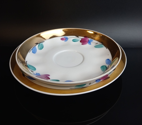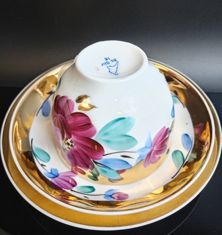 Чайное трио «Агашки» на 1 персону чашка, блюдце, десертная тарелка (диаметр - 17.5 см) , клеймо Дулево ФЗ, цветы, позолота, ручная роспись, фарфор винтажный СССР 1988 год. «Поздний вечер».
