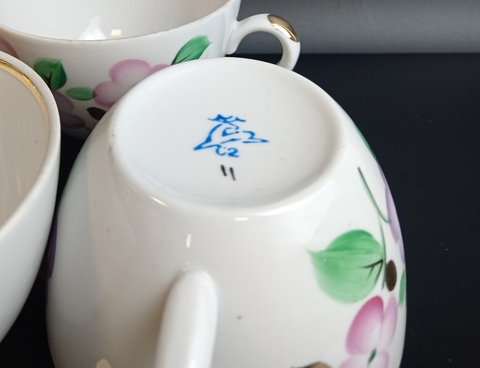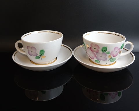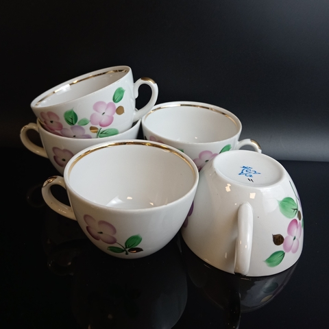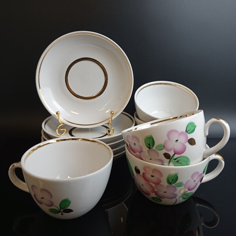 Чайные пары на 5 персон (5 чашечек и 5 блюдец), Кузяевский ФЗ, роспись цветы, позолота, винтаж СССР 1970-1991 гг. Диаметр блюдца - 13.5 см. Присутствуют следы использования - состояние на фото