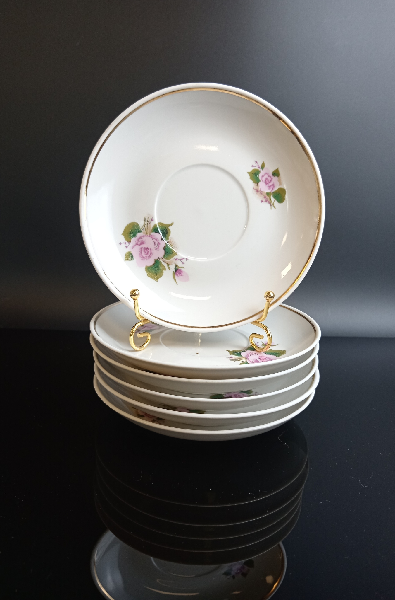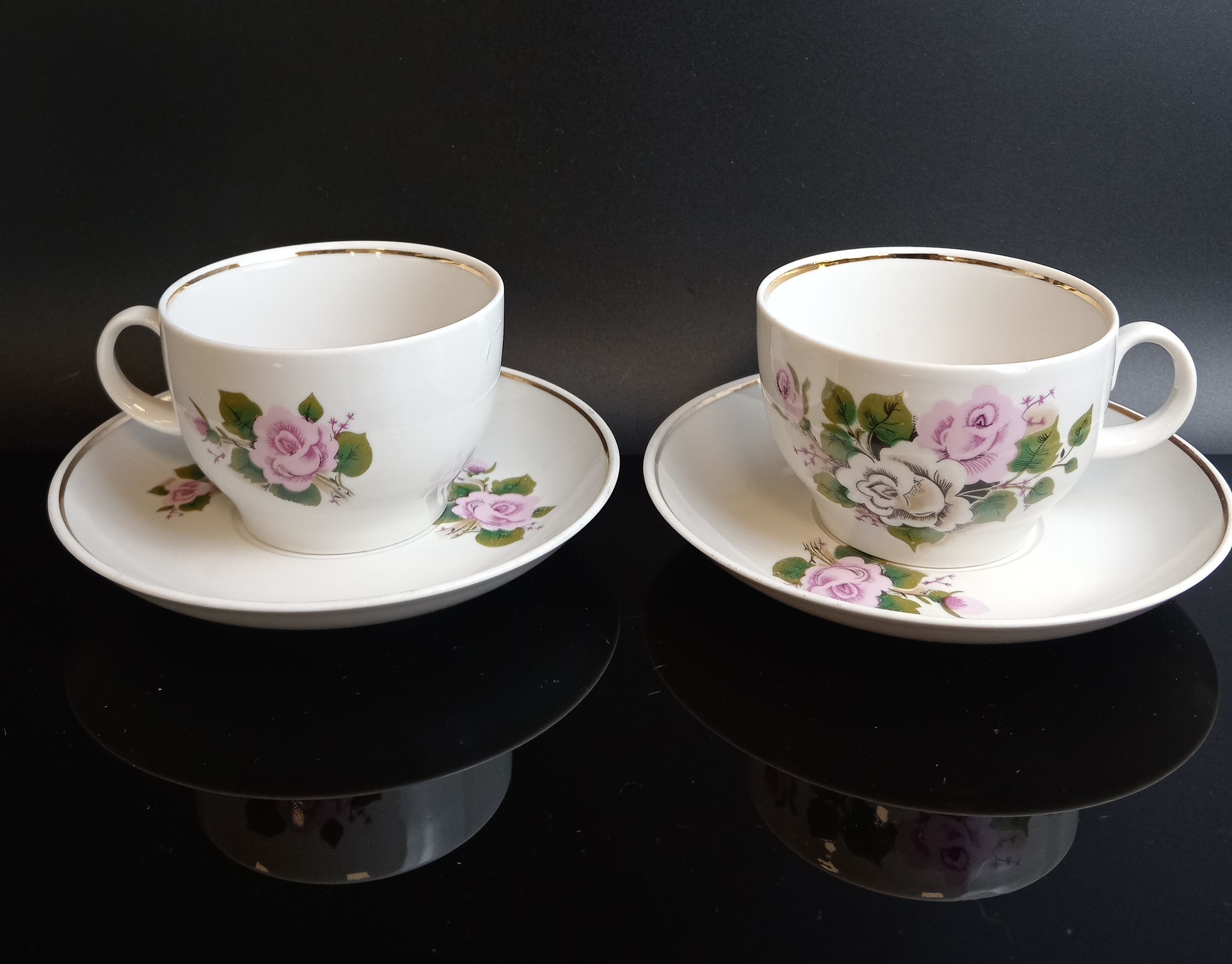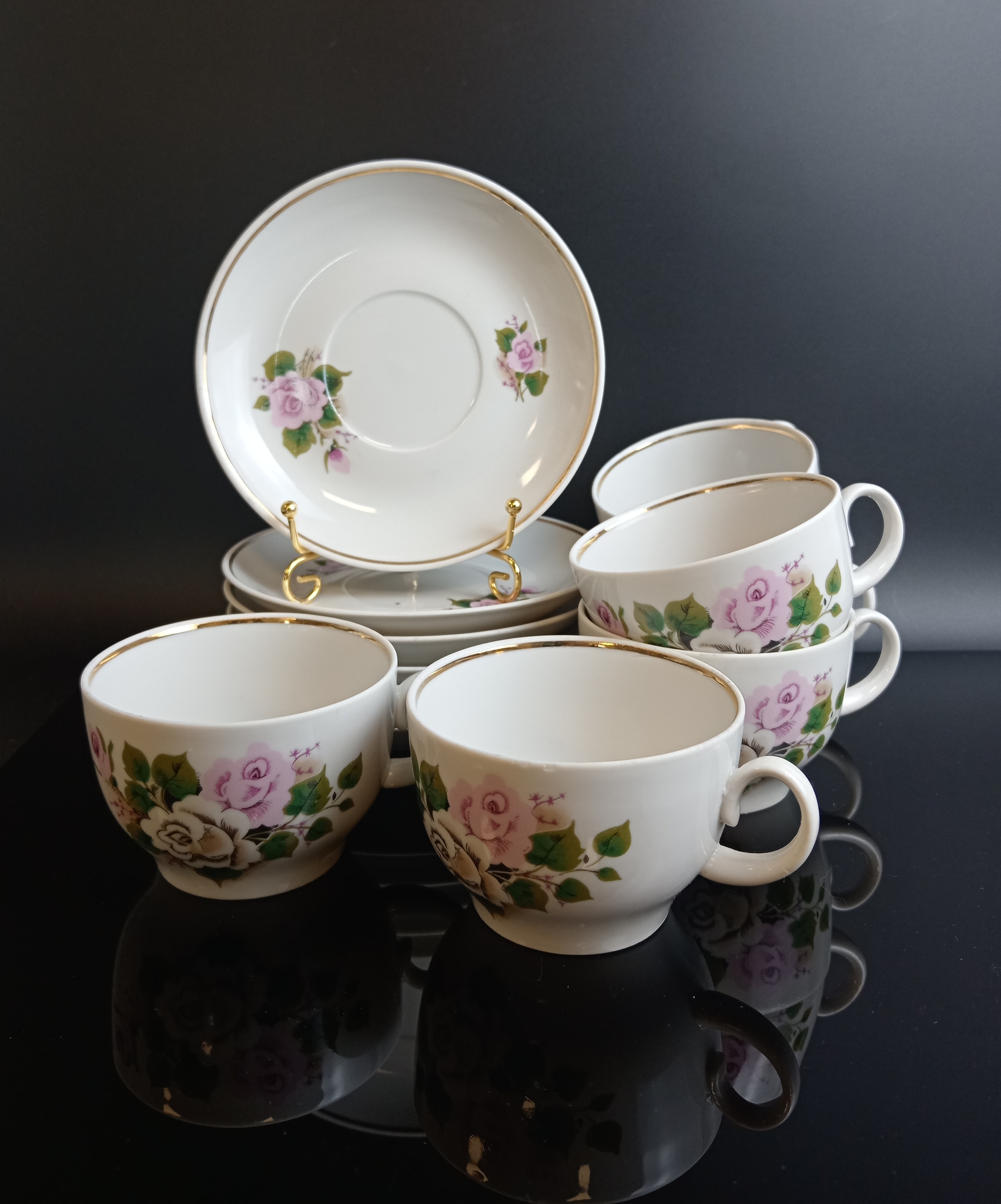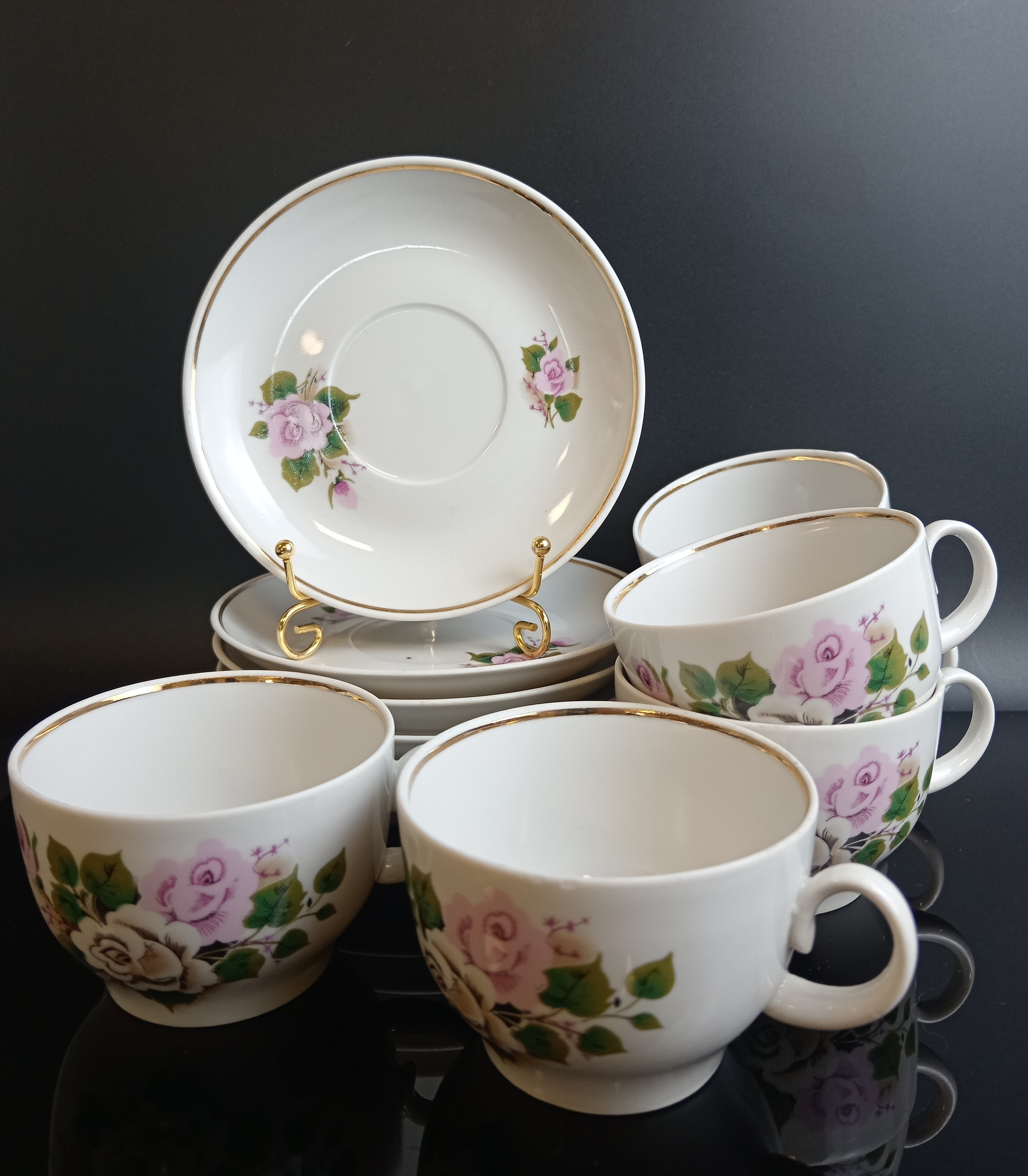 Чайные пары на 6 персон (6 блюдец и 6 чашечек), розы роспись цветы, позолота, Красный фарфорист, винтаж СССР 1971-1990 гг. Диаметр - 14 см. Присутствуют следы использования - состояние на фото