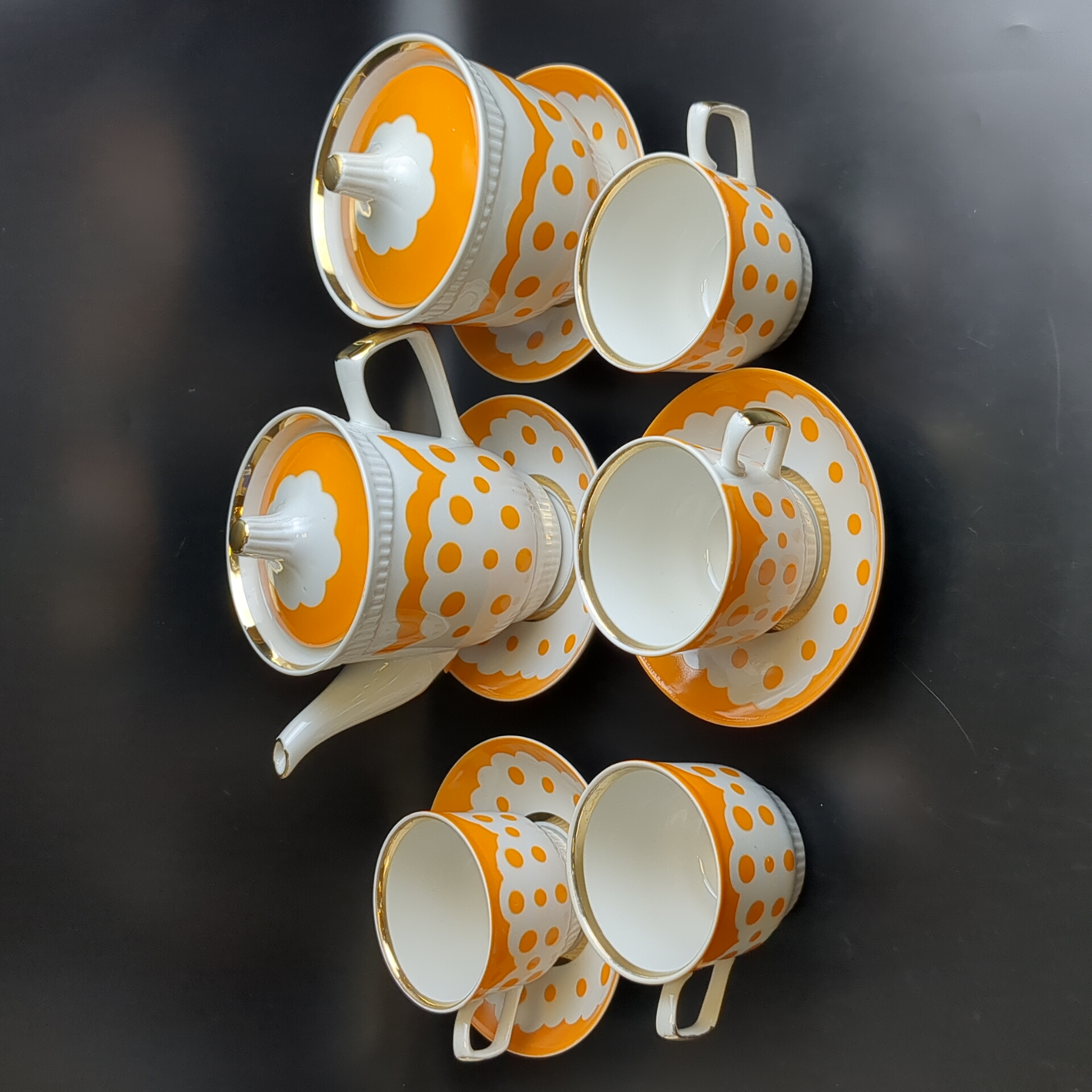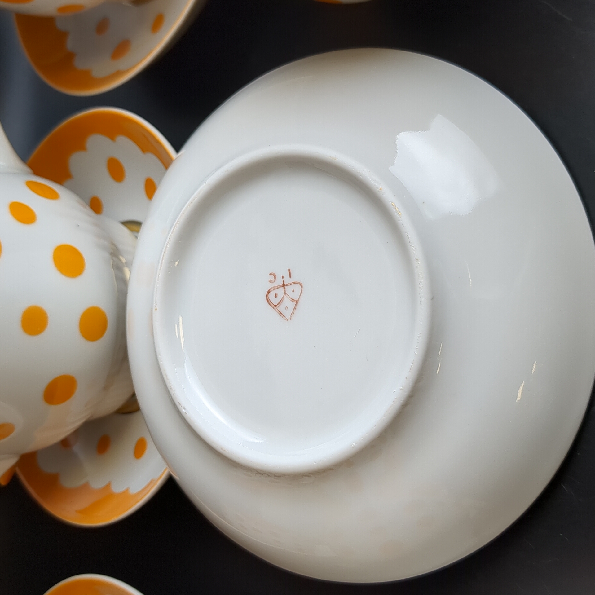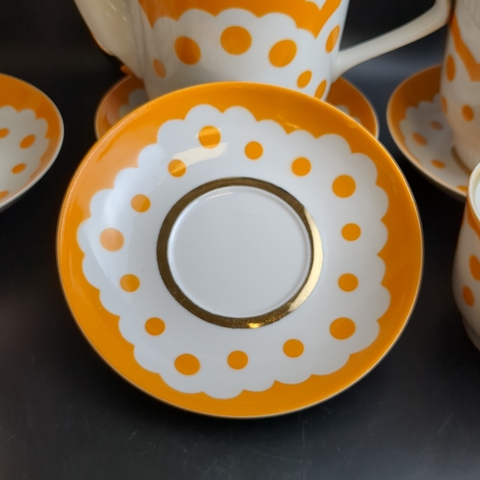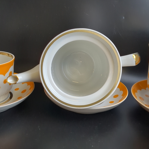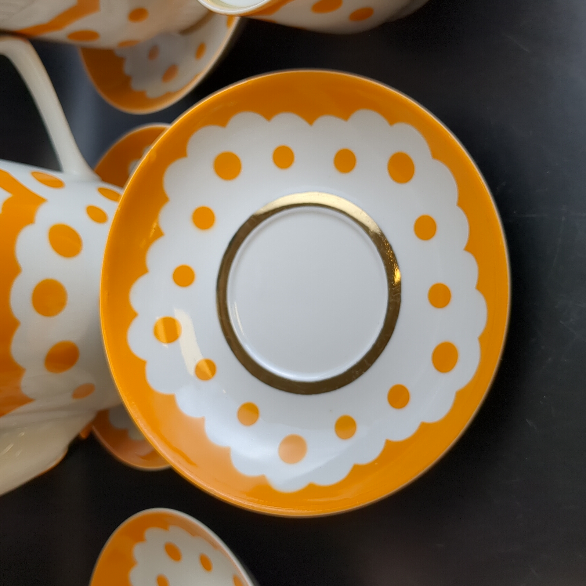 Чайный сервиз из 10 предметов, чайник заварочный, сахарница, 4 чайных пары, "Горох" Южно-Уральский ФЗ, фарфор, винтаж СССР 1970-1990 гг. Состояние и комплектация на фото