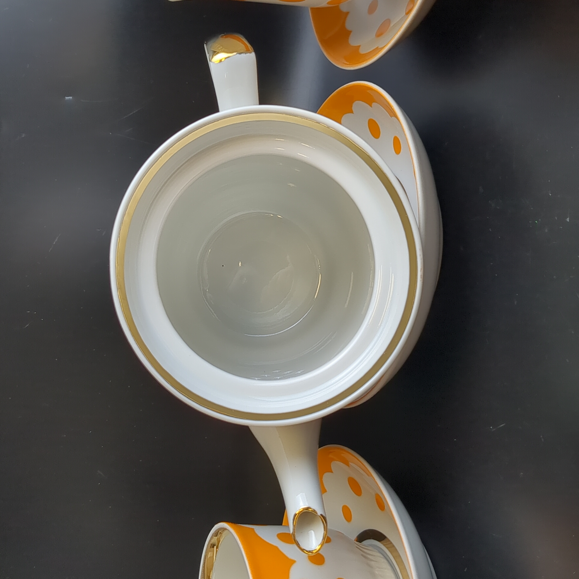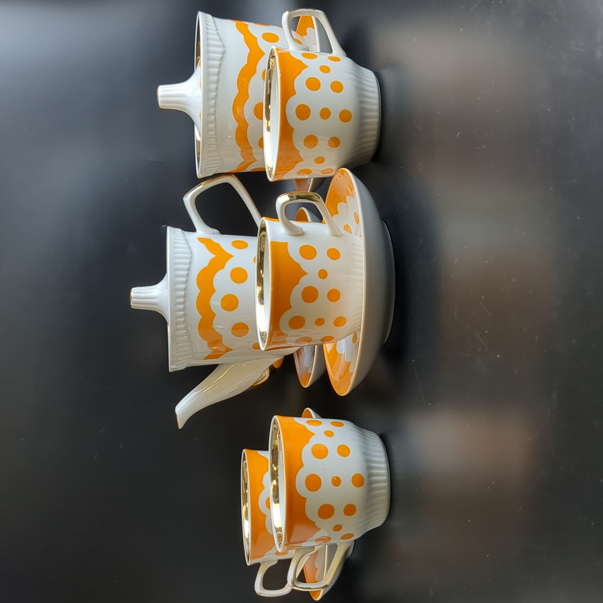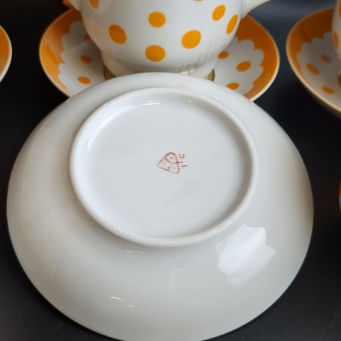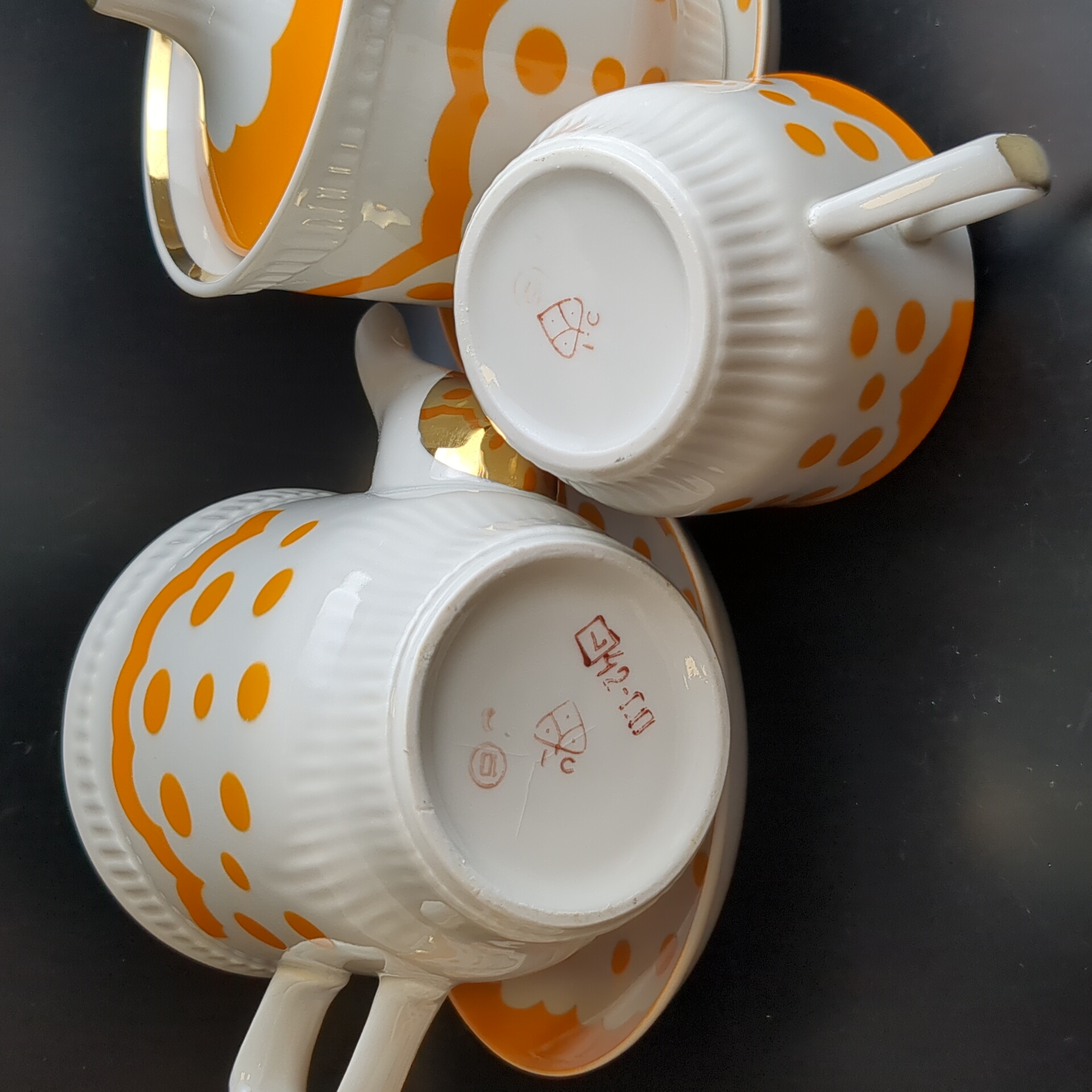 Чайный сервиз из 10 предметов, чайник заварочный, сахарница, 4 чайных пары, "Горох" Южно-Уральский ФЗ, фарфор, винтаж СССР 1970-1990 гг. Состояние и комплектация на фото