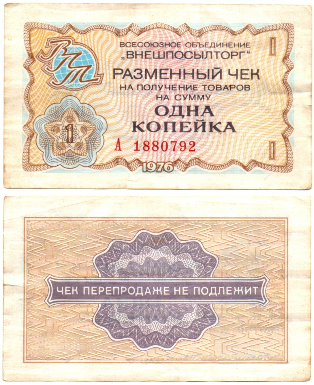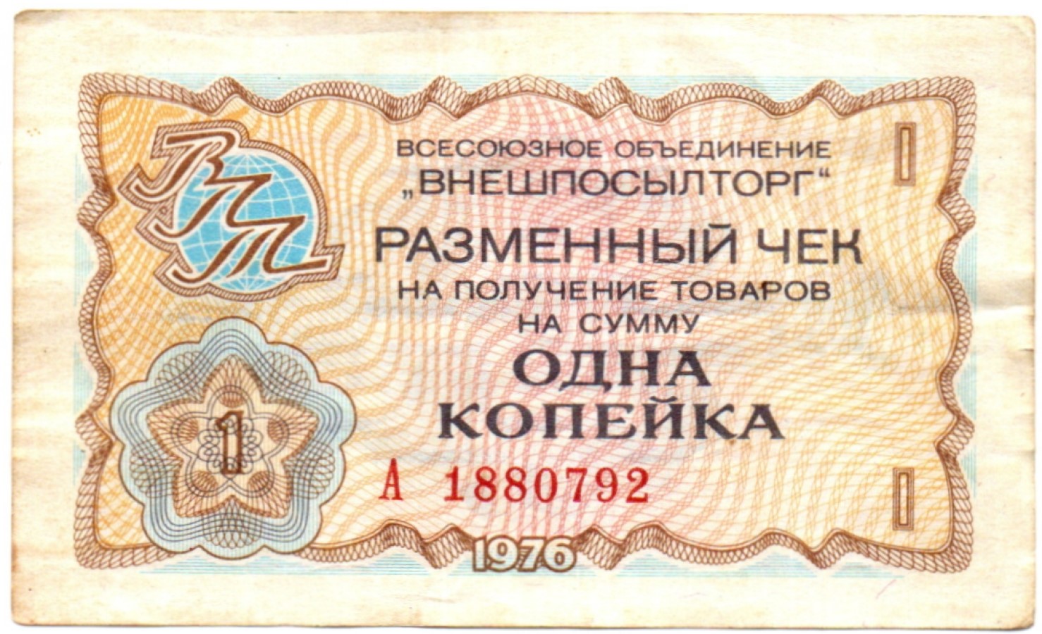 Чек Внешпосылторг 1 копейка 1976 год. А1880792