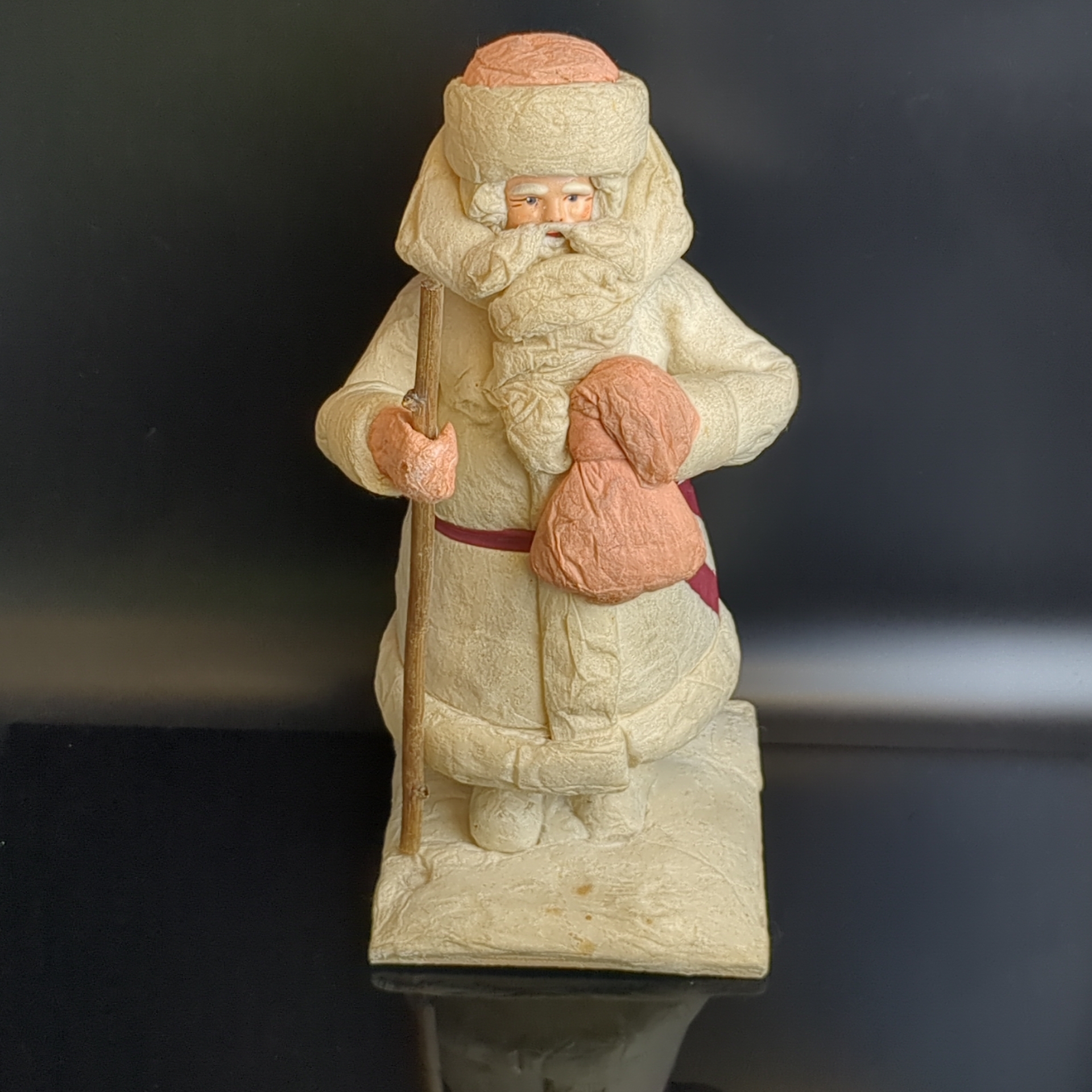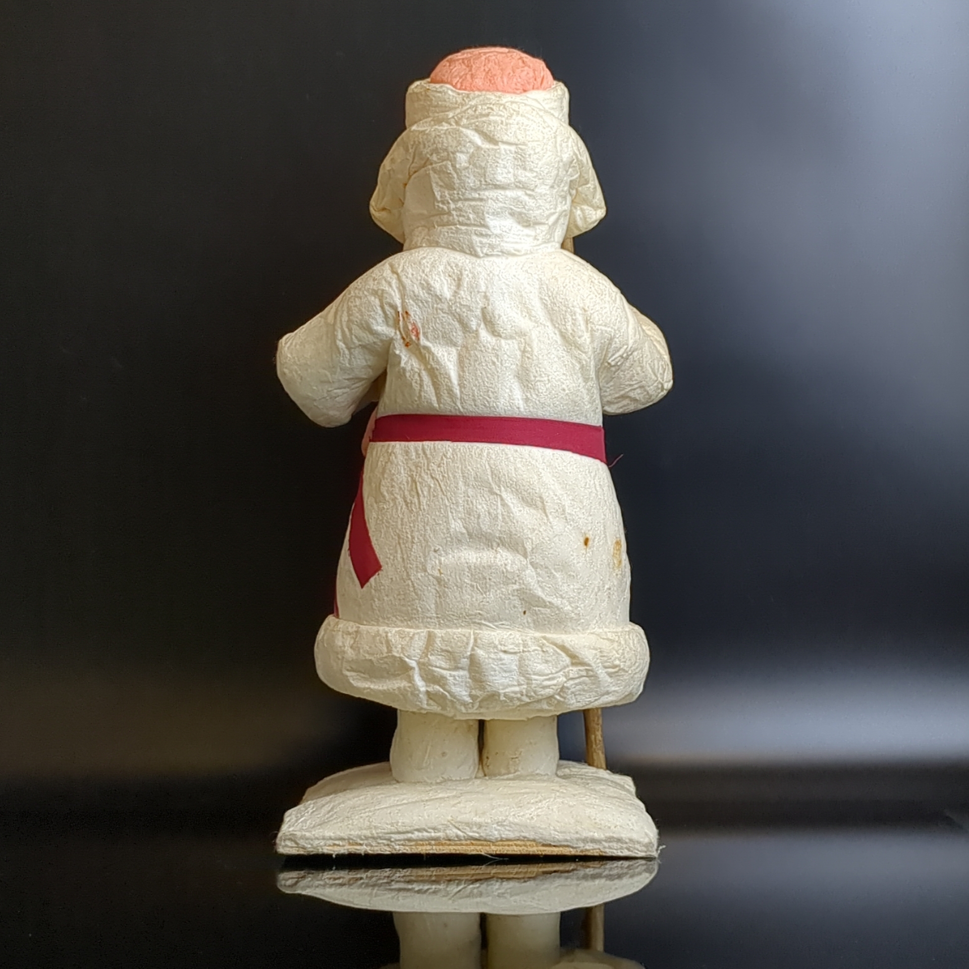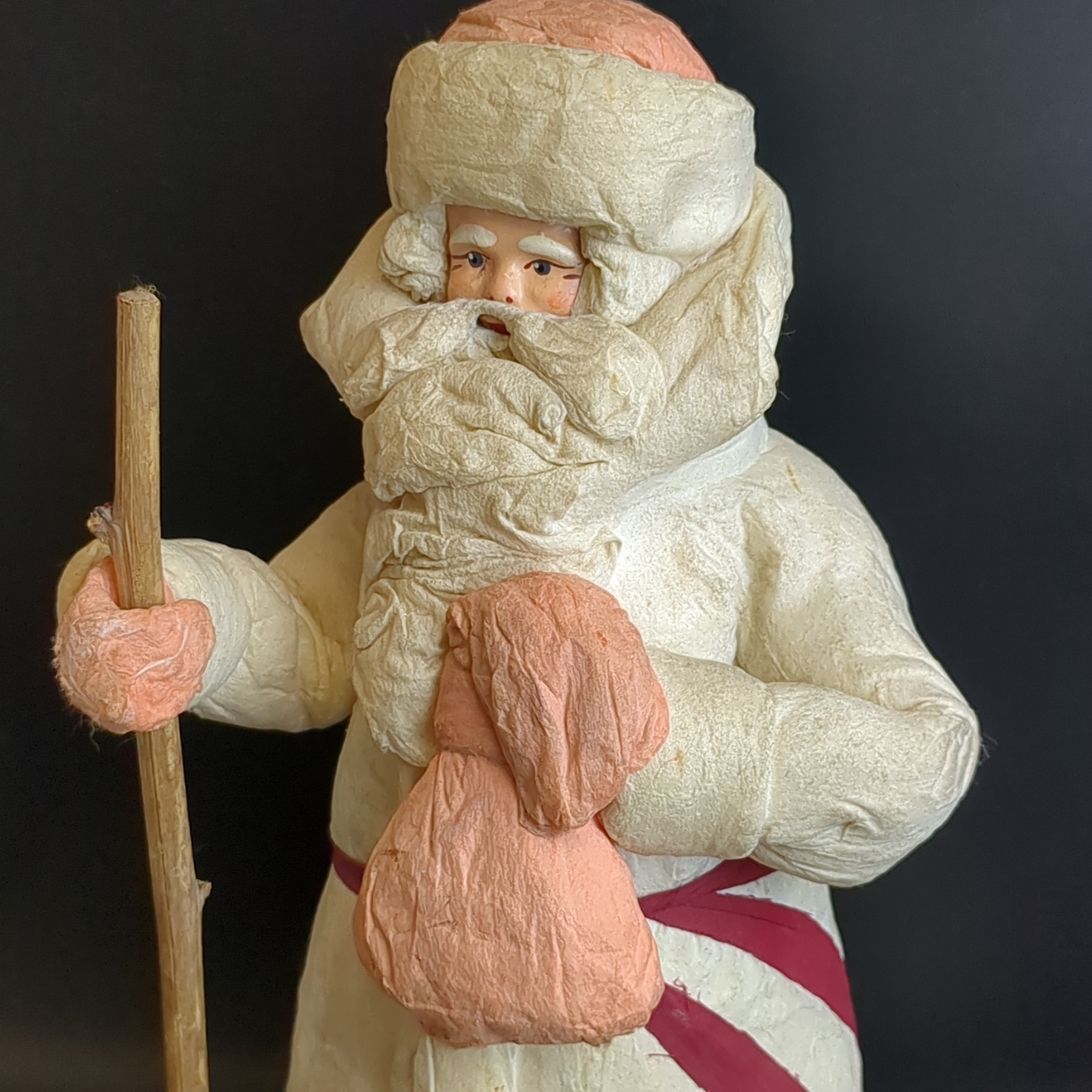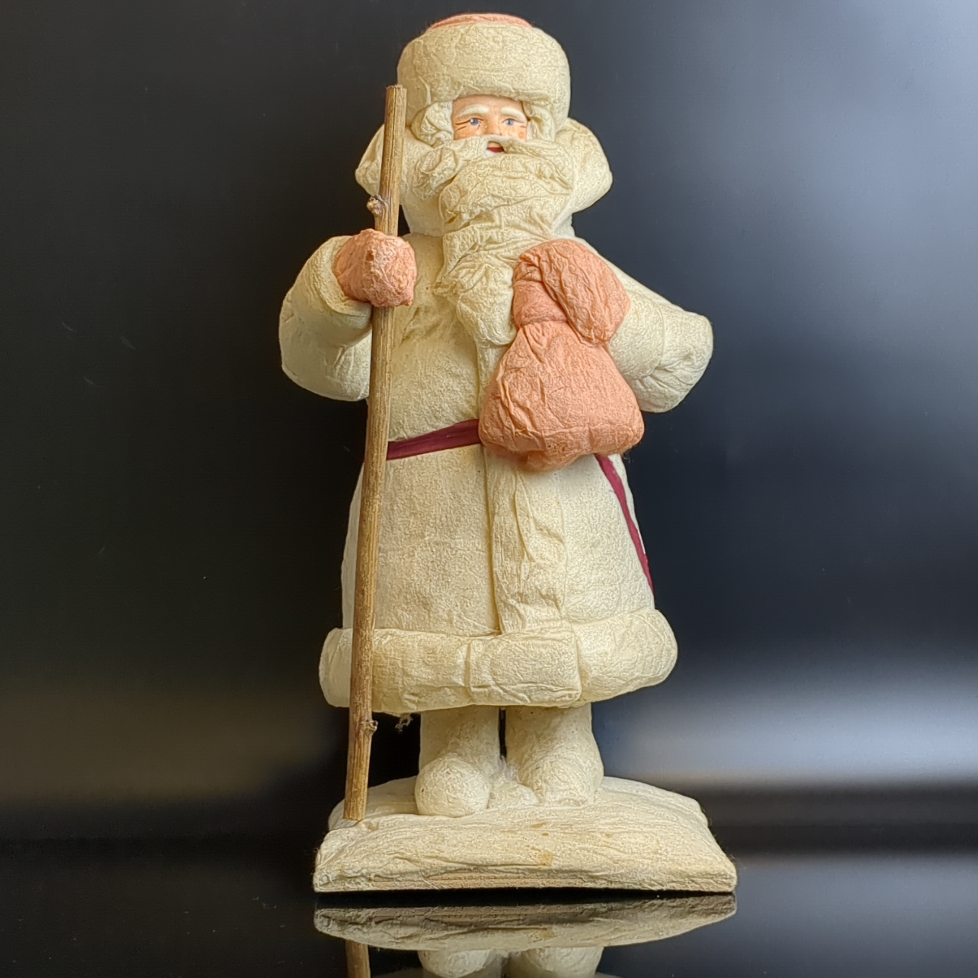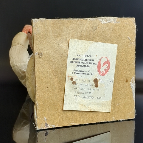 Дед Мороз советский Папье-Маше из ваты с посохом и мешком, высота - 29 см, этикетка "Ярославль" производственное швейное объединение, винтаж СССР 1970 год.