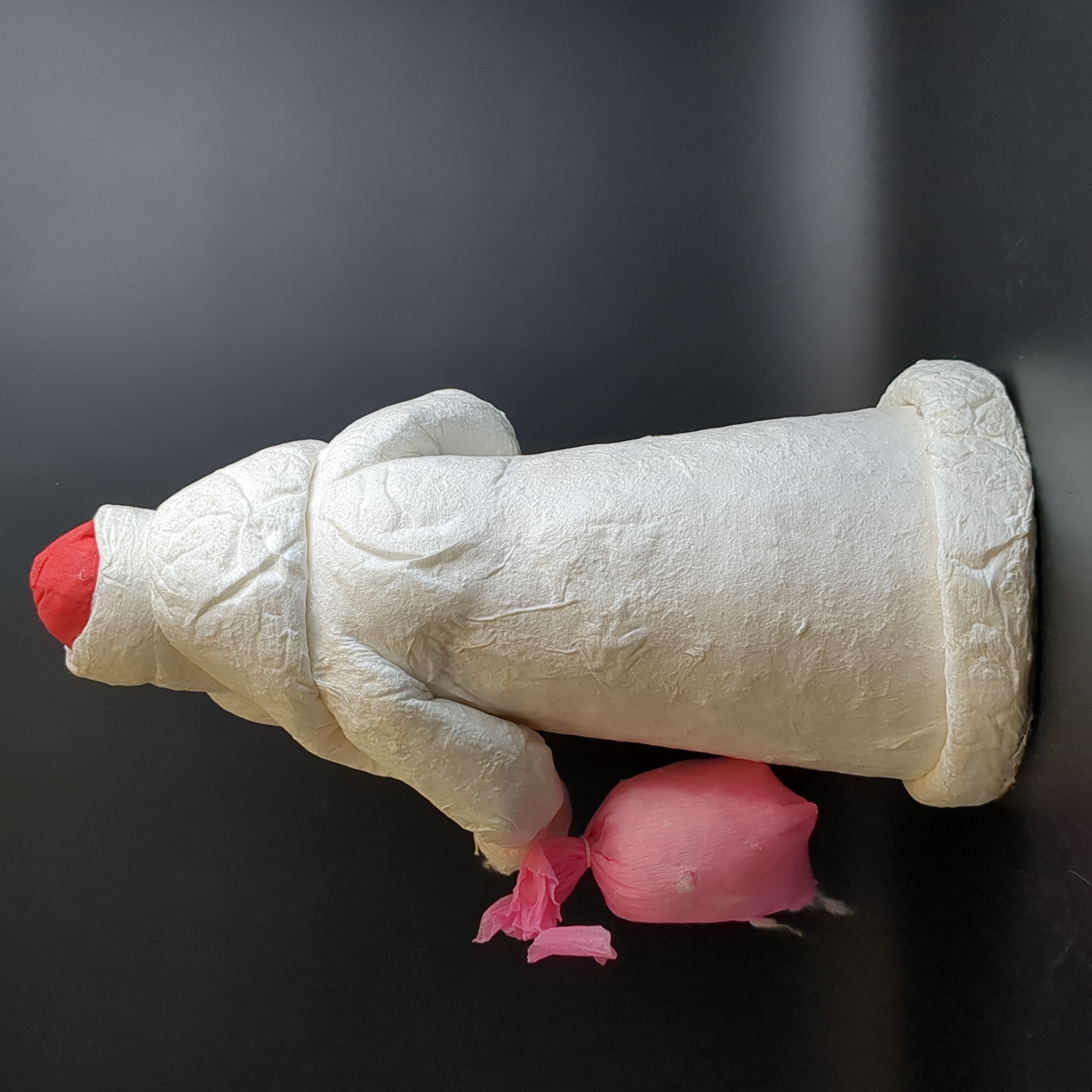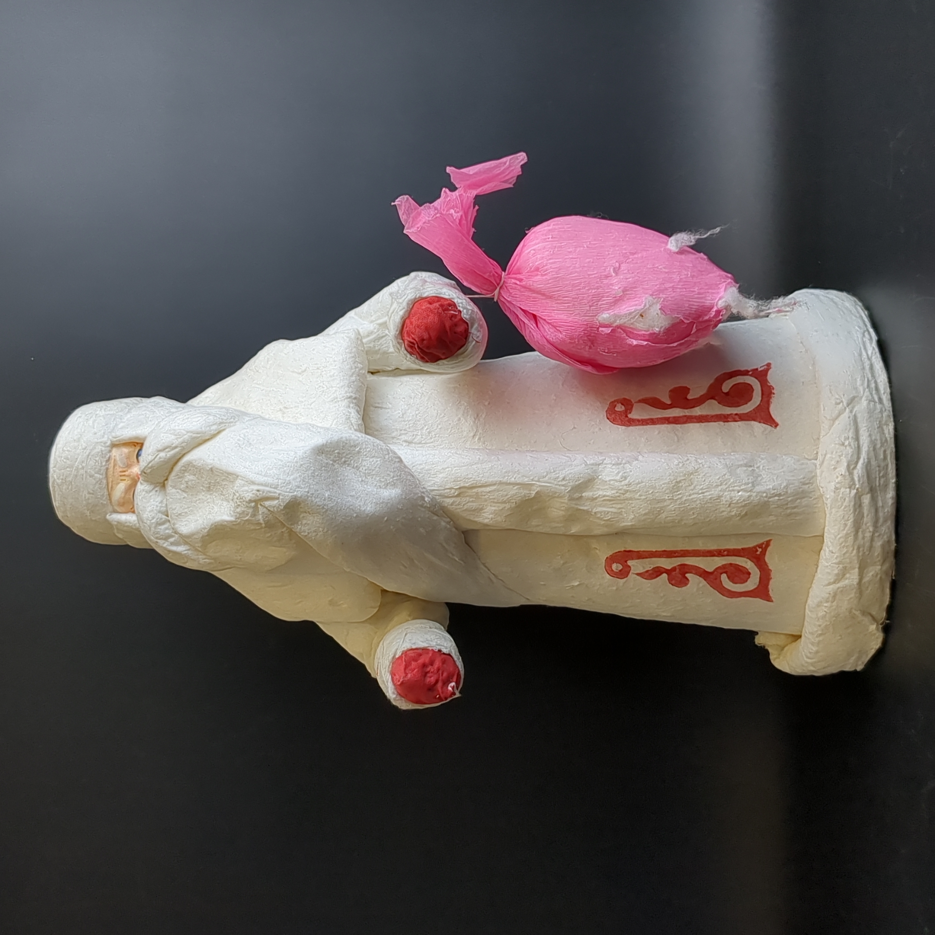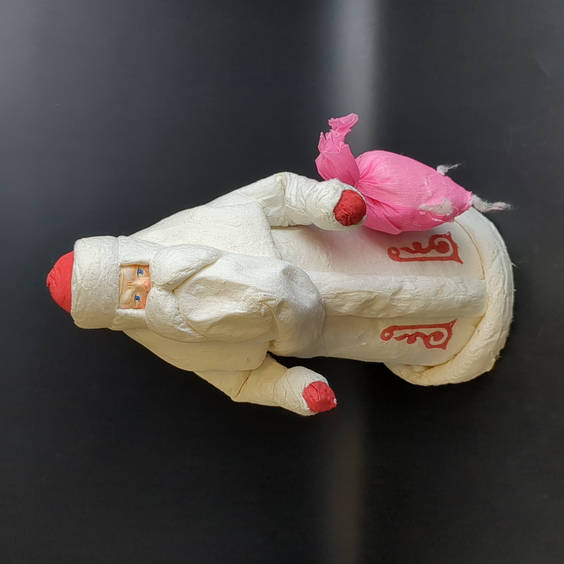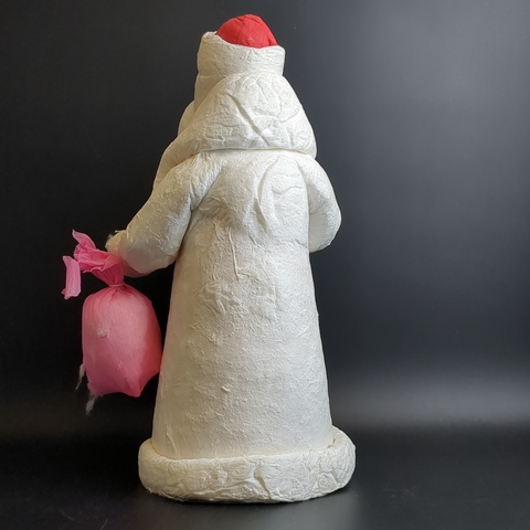 Дед Мороз советский Папье-Маше из ваты, ткани, 32 см, этикетка клеймо Калининское производственное объединение художественной промышленности, СССР, 1960-1970 гг.