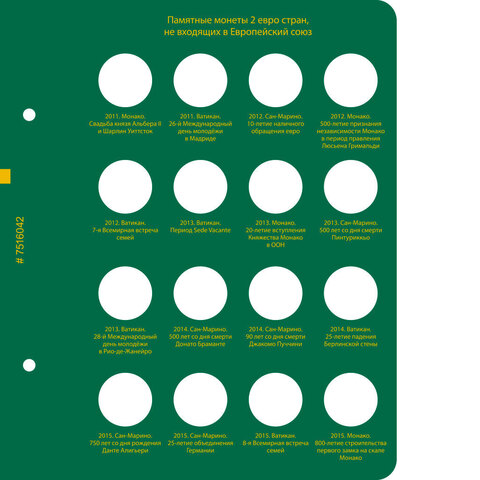 Лист предназначен для монет номиналом 2 евро, выпускающихся странами, не входящими в Европейский союз (Андорра, Ватикан, Монако, Сан-Марино) 2011-2015 гг.