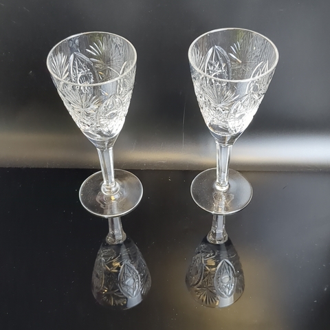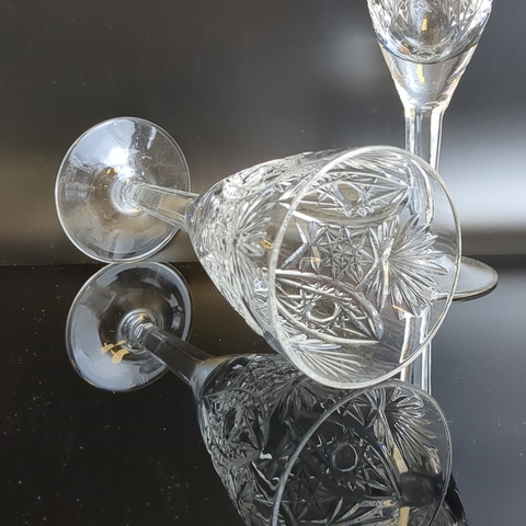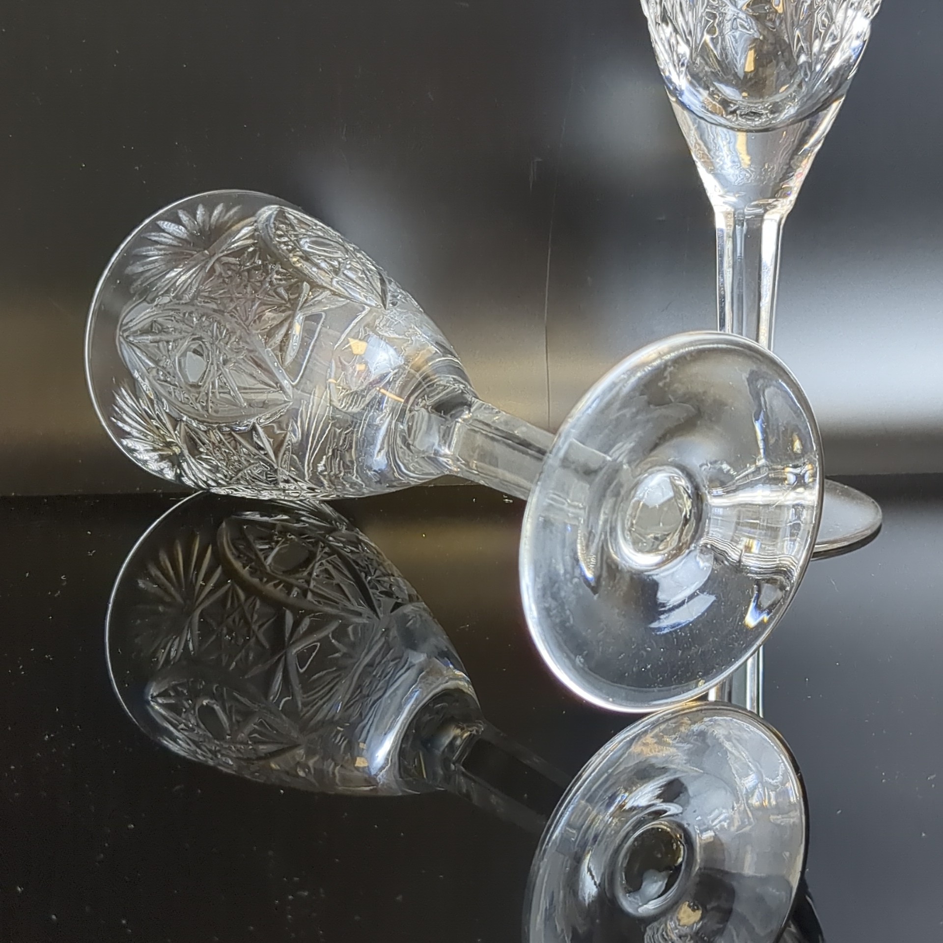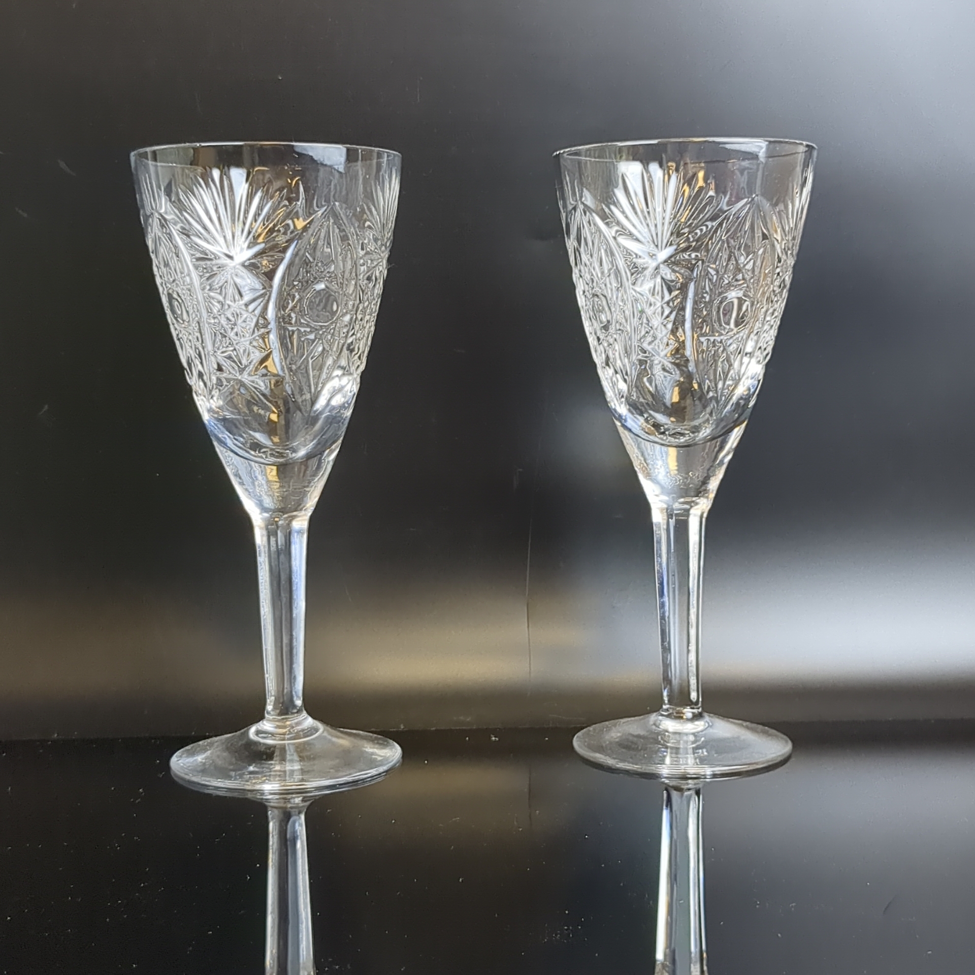 Два фужера для вина хрустальные, алмазная грань, геометрический орнамент, (объём-? мл), высота - 18 см, винтаж СССР 1970-1990 гг. Состояние на фото
