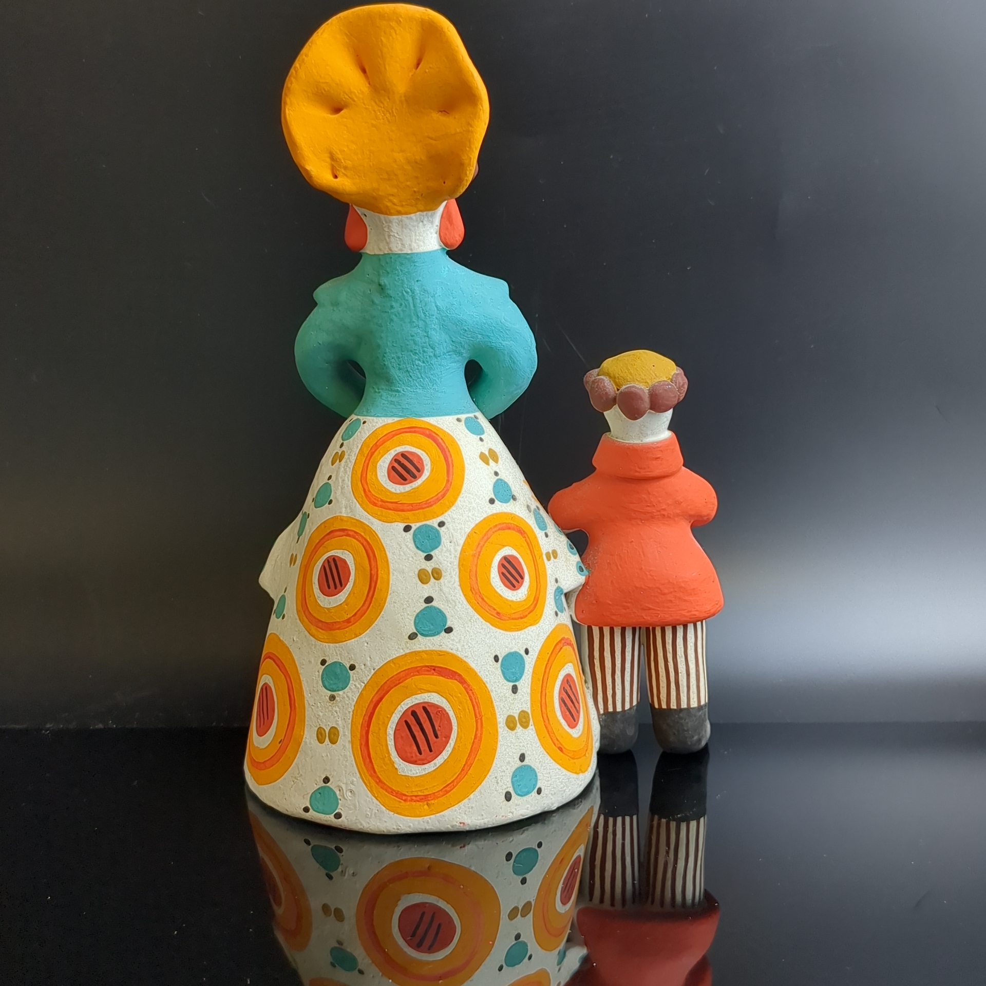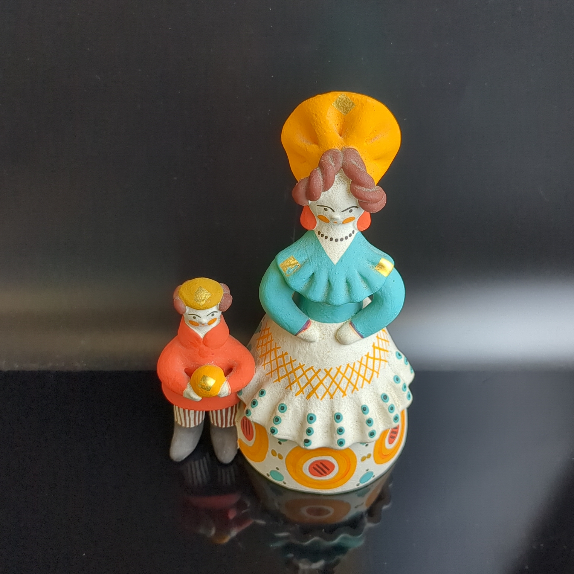 Дымковская игрушка Барыня Кормилица с ребенком. Глина, ручная лепка и роспись, Киров-Дымка, винтаж 1970-1990 гг.