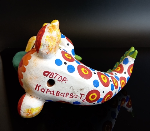 Дымковская игрушка Дракон с шампанским. Год дракона. Глина, ручная роспись, сусальное золото.Высота 18 см. Состояние на фото