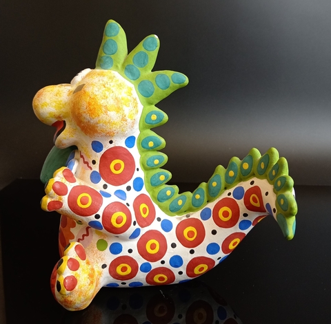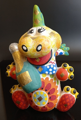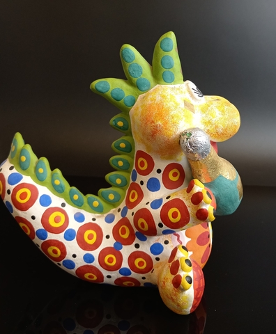 Дымковская игрушка Дракон с шампанским. Год дракона. Глина, ручная роспись, сусальное золото.