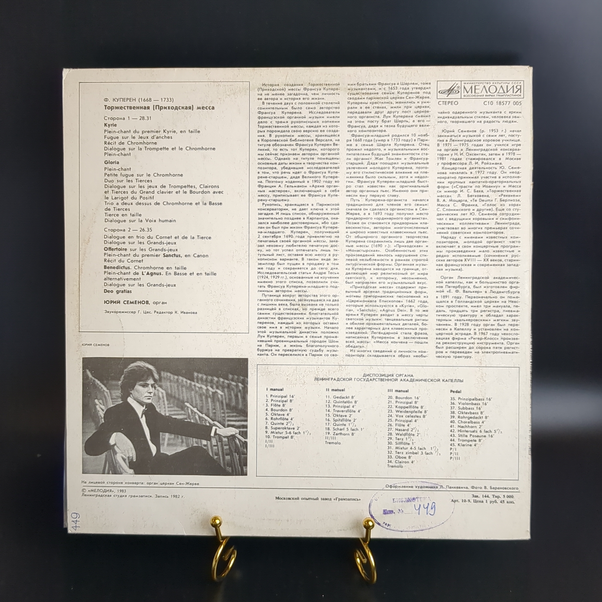 Ф. Куперен/F. Couperin винловая пластинка 12 Юрий Семенов орган, Торжественная (приходская) месса, LP, винтаж классика, Мелодия СССР 1983 год. Классическая музыка на виниле. Конверт: EX+Диск: EX+