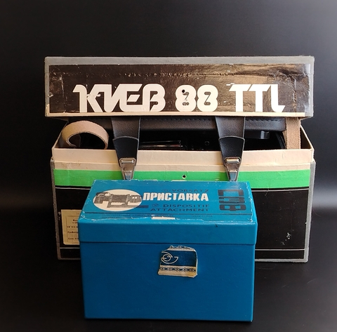 Редкий фотоаппарат "Киев 88 TTL" с объективом Волна-3, чехол, кофр, оригинальная коробка, рукоятка, призма, бленда. СССР. Комплектация на фото