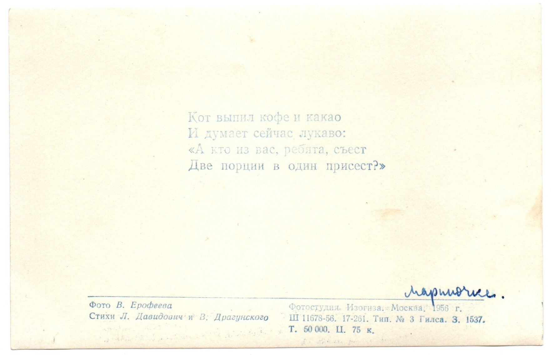 Фотооткрытка. Котята. Посуда. Стихи. 1956 г. XF
