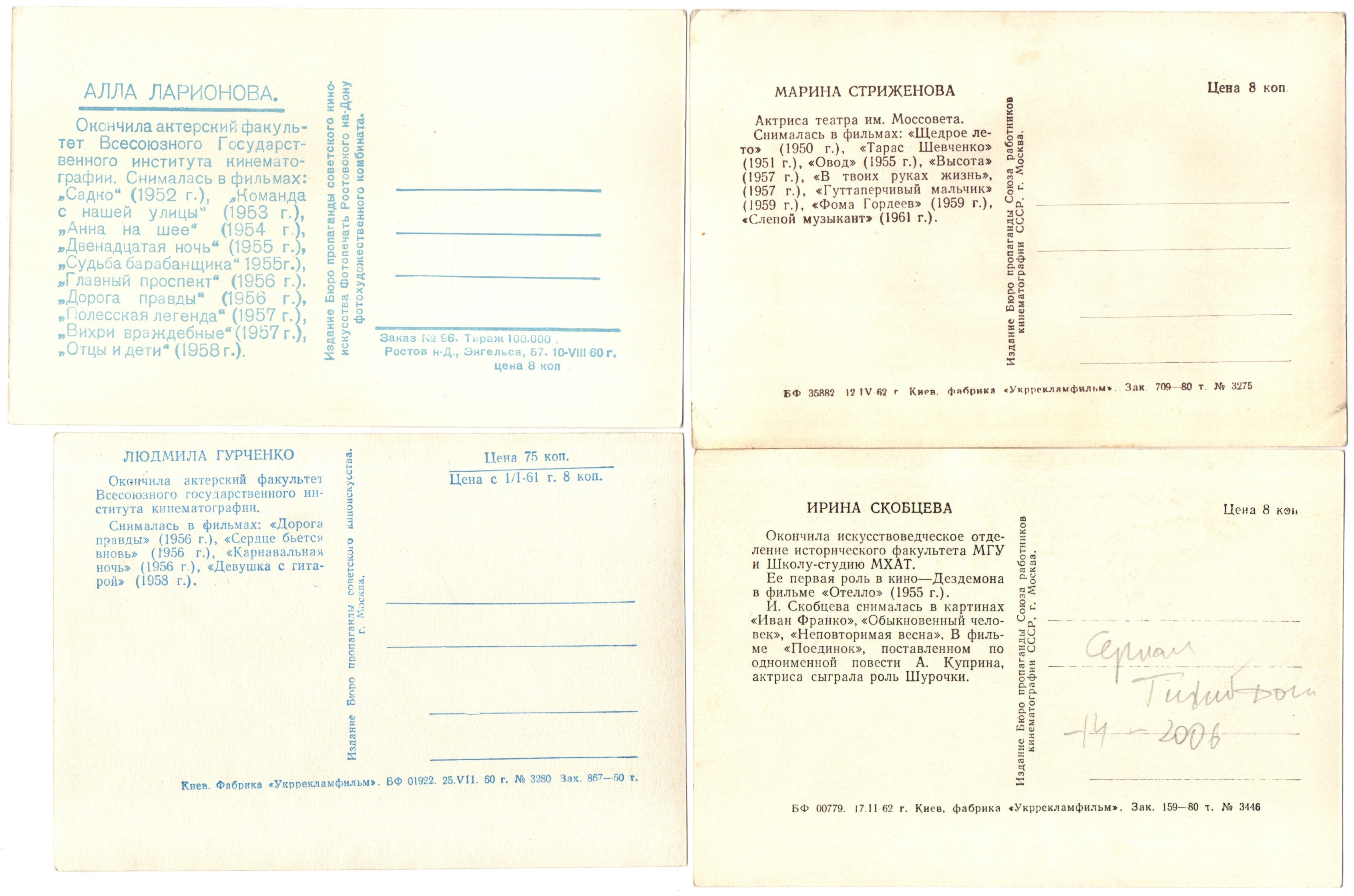 Фотооткрытки 4 шт. Артисты советского кино Гурченко Ларионова Скобцева Стриженова 1950-60 гг XF