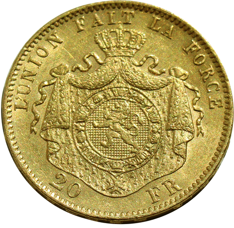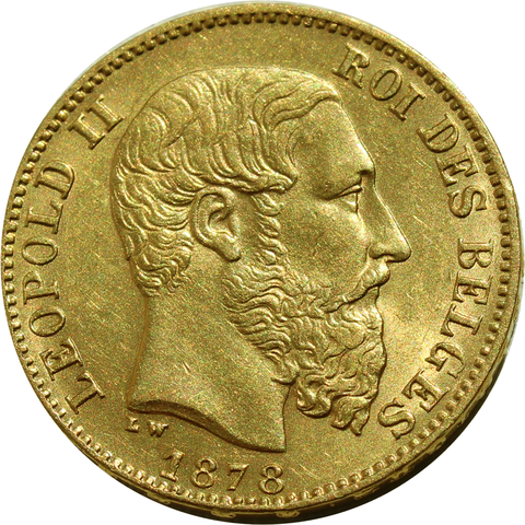 20 франков 1878 год. Бельгия. Леопольд II. Золото XF-AU