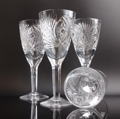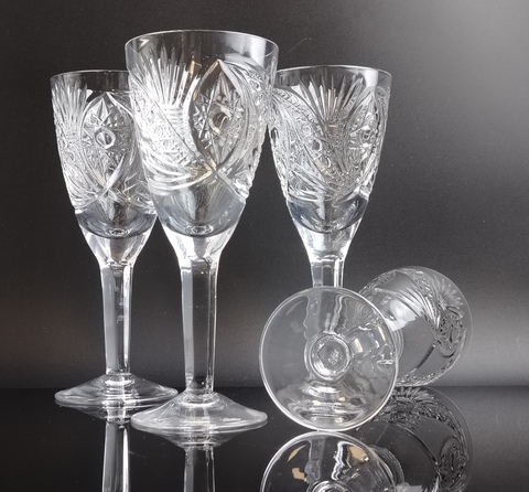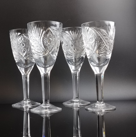 Фужеры для шампанского набор из 4 штук, хрустальные, высота - 15 см,100 мл., алмазная грань, геометрический орнамент , винтаж СССР 1970-1990 гг.